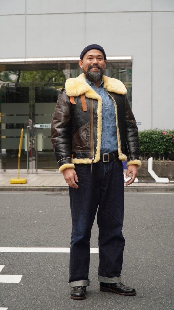 フライトジャケットに関する知識は世界有数というフライト賢者、亀屋さん。この日のA-2はエアロレザーの1941年コントラクトモデル(BR80103)。15年着用しており表面が擦れ、特有の色気を醸し出している。襟やポケットフラップのスナップボタンの美しいアタリは、さすがの仕上がり。