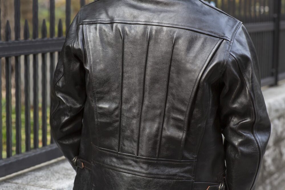 ウエアハウスのホースレザーカーコートを主役としたスタイリング。5年ほど着込んでおり、パーツ毎に茶芯仕様ならではのムラが出て、まるでヴィンテージのような風合いになっている。特に背面は、そのムラ感が顕著で、作り手の狙い通りになっており、見事な経年変化である。
