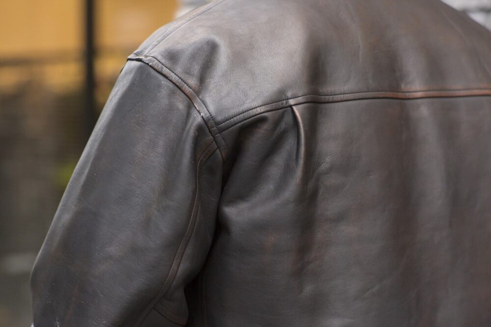今シーズンにリリースされたオールドジョーのレザージャケットは早くもいい風合いに。この理由は、レザーと製品の段階で2回の加工を施したオリジナルのパティーナレザーだから為せる技。このレザーは茶芯のブラウンなので、奥行きのあるカラーリングとなっているのだ。