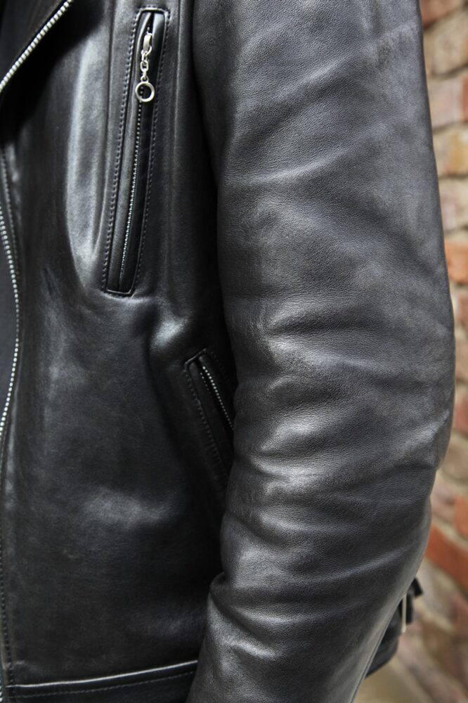 ショットのニューダブルブレストライダースを中心に、全身をブラックで合わせた鈴木さん。しなやかなシープスキンは身体馴染みがよく、軽い着心地も気に入っているという。3年着用しているだけあり、腕にはゆったりとしたジャバラが出現し、光沢感が増している。気持ちゆったりしたサイズ感も◎。