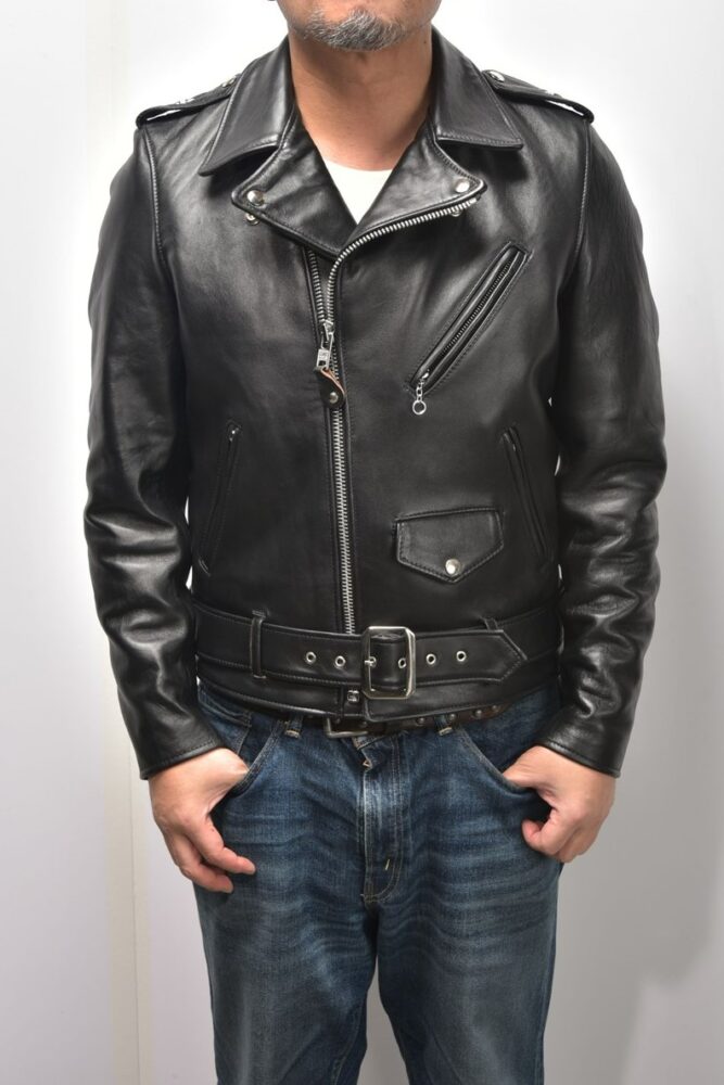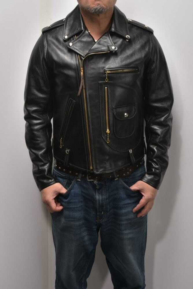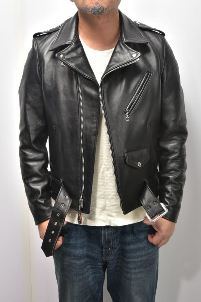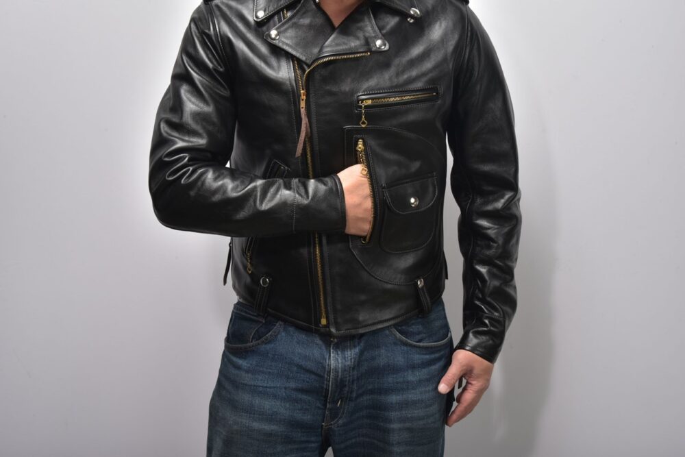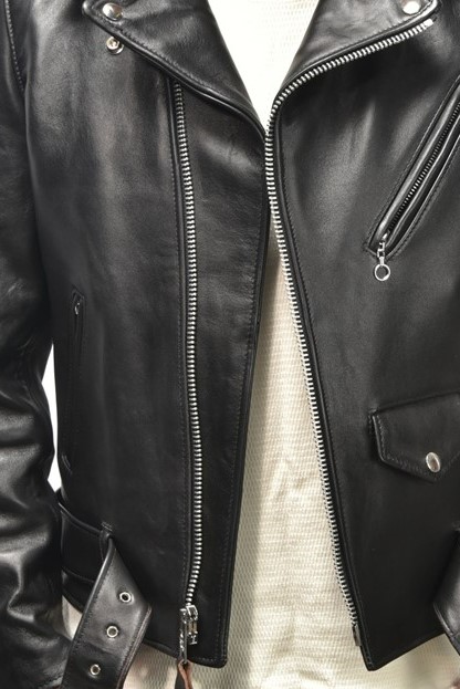 ダブルライダースは本来フロントを閉じて着用するものだが、往年のロックシンガーの影響により、フロントを開ける着方に憧れる人も多い。その際に気を付けたいのが「前立て」。この前立ての幅が太いと、開けて着た時に前立てばかりが目立ちカッコよくない。モチーフにしている年代が旧くなるほど前立てが太くなるので、注意が必要だ。