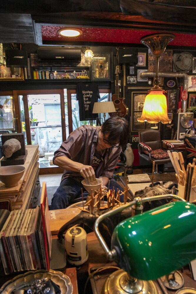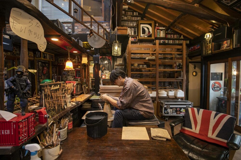 京都の築95年の町屋を改装した自宅兼アトリエを訪れてみると、そこは外観からは想像も付かないイギリスの古いパブに迷い込んだような異国情緒溢れる空間が。そして、その中心には舞台のようにワークスペースとなるろくろ台が鎮座している。