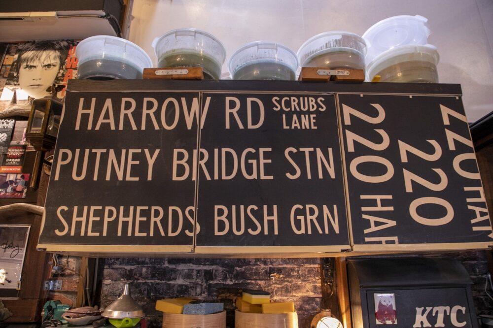 ロンドンのバスで実際に使用されていたヴィンテージのバスロールサイン。紙の質感や文字などが好きでコレクトしているという。