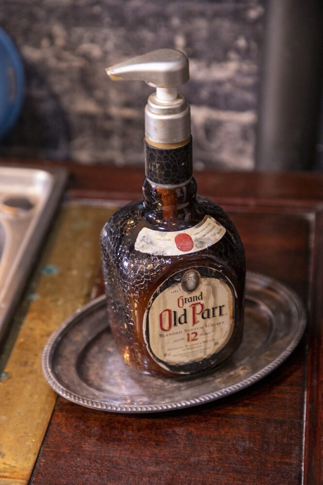 アトリエ内の洗面所に置いてあるハンドソープボトルは最も愛飲するオールドパーの空きボトルをカスタマイズ。この徹底ぶりはお見事。