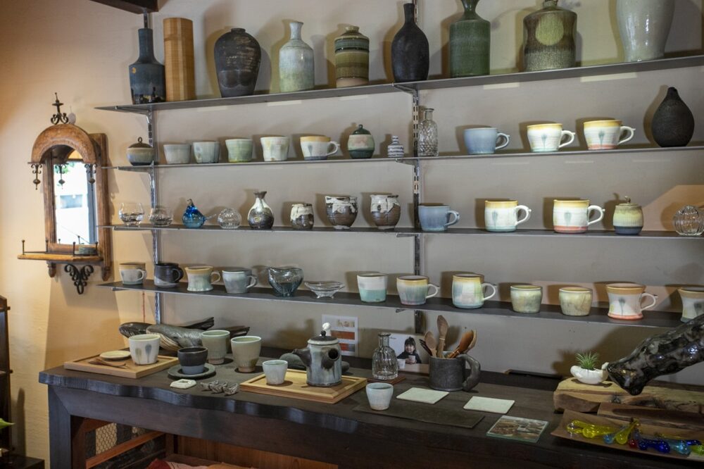 ギャラリーには作風に取られずオリジナル作品を作る冨金原さんの作品だけでなく仲間の作家の陶磁器やガラス作品も並ぶ。