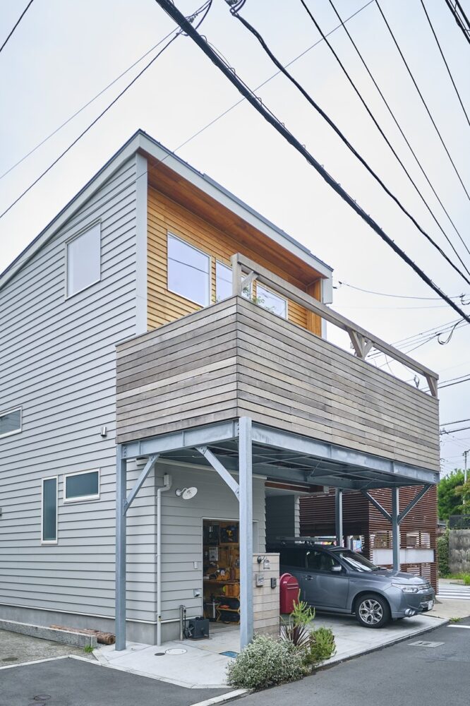自宅の外装は、ラップサイディングとウッドサイディングの外壁を効果的に配置したアメリカンな佇まい。海まで徒歩10分ほどなので、ウッドバルコニーには心地よい海風も入ってくる。
