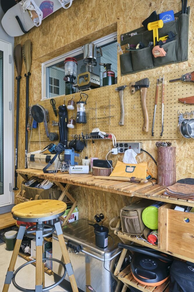 ガレージに大きなキャンプギアと一緒に、SUPやスノーボードなどの遊び道具、DIY工具も収納。