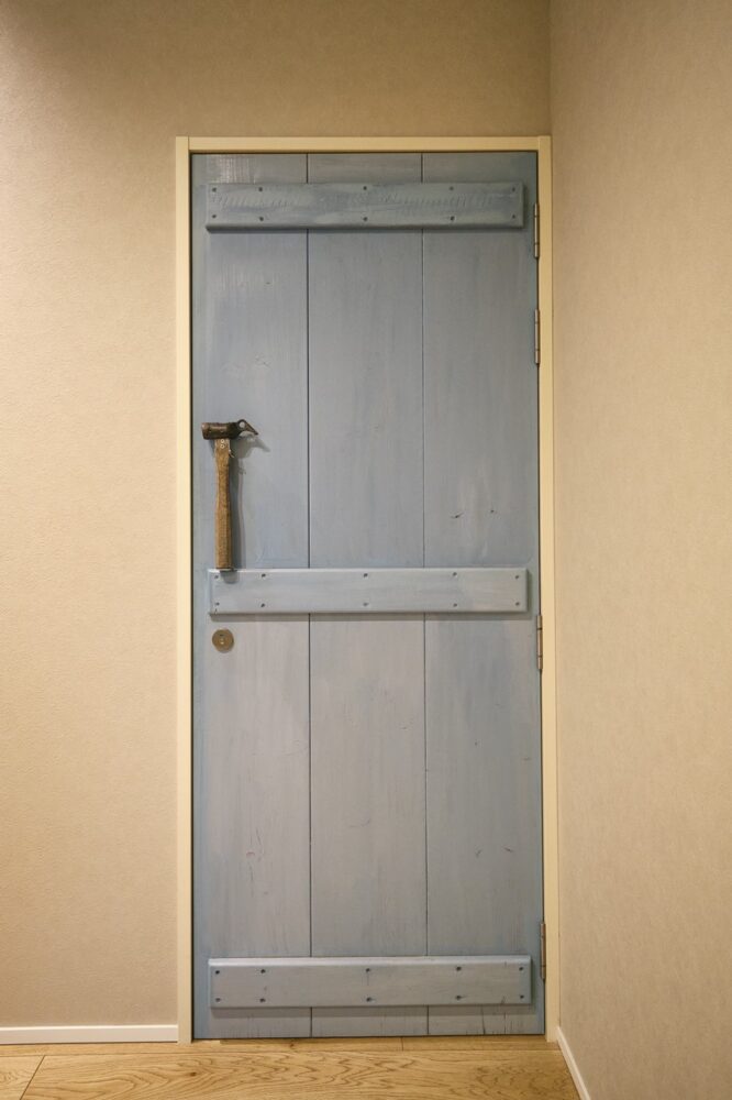 トイレの扉はドアノブの代わりにハンマーが設置されたユニークなデザイン。「ブランドをやっている友人から譲り受けました」