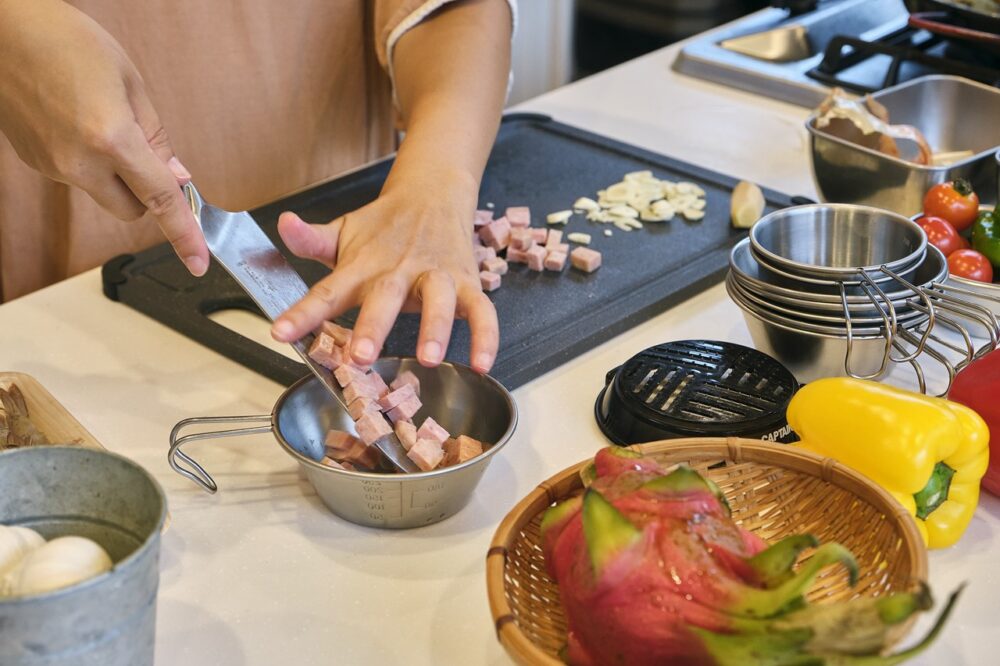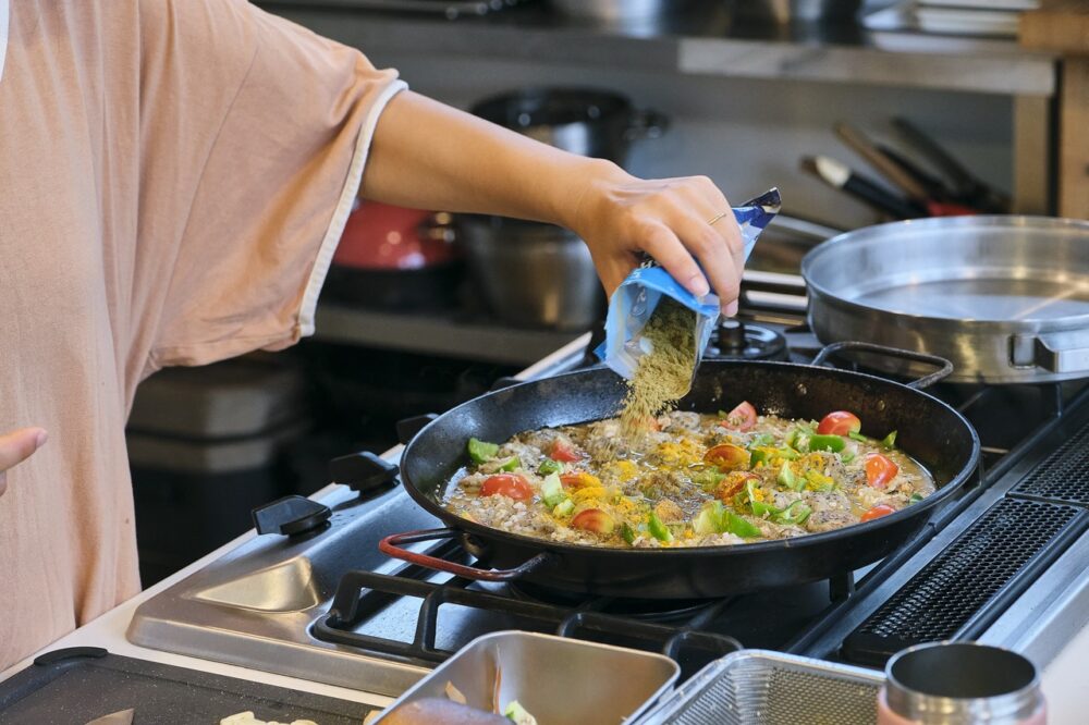 手際よく料理をする奥様。調理中の食材を入れているのもアウトドア用のシェラカップ。