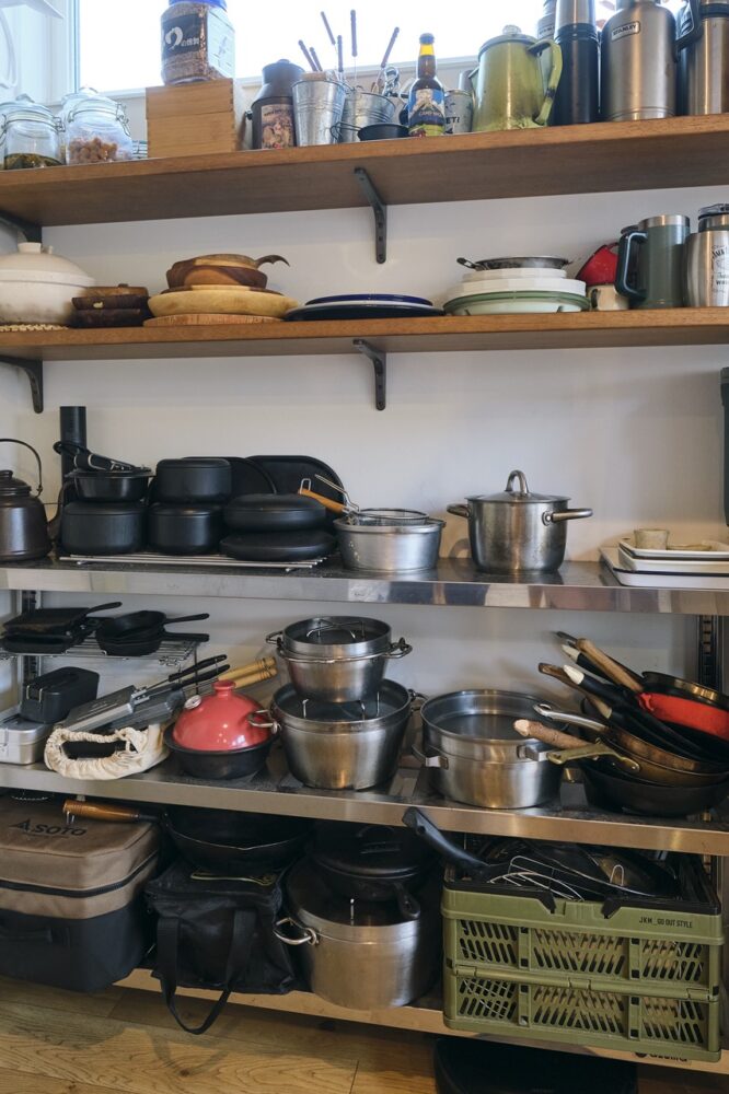 「キャンプ用のキッチンツールが充実しているから、自然とアウトドア料理をする機会が増えた感じです。しかもそれを楽しむ場所もある。キッチンである程度まで仕込んだら、ウッドバルコニーのグリルでゆっくり焼き上げたり。むしろ最近は家電の出番がどんどん減っていますね。白米もダッチオーブンや土鍋の方が美味しく炊けるし、スキレットは本当に万能。冬は薪ストーブも大活躍しています」