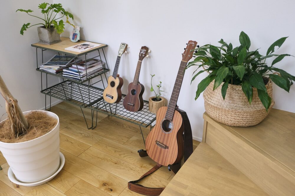 アウトドア用のフィールドラックを重ねてディスプレイ棚に。趣味のギターやウクレレもインテリアとして活用。「夫婦がそれぞれ撮影で使える家にしたかったので、簡単に片付けられる家具しか置いていません」