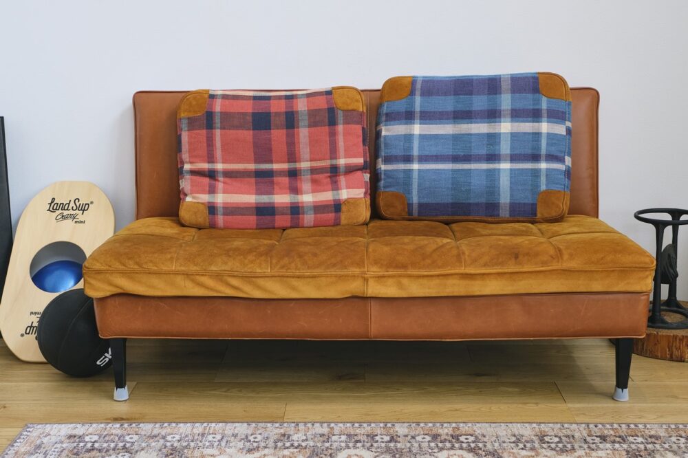 リビングの一角にはクラッシュゲートのレザーソファを設置。「なるべくリビングを広く使いたいから、ちょっとコンパクトなサイズを選びました。3年くらい愛用しているので、少し風合いが出てきたかも」