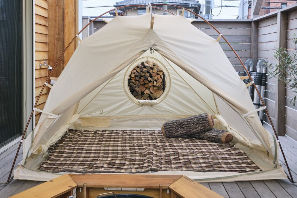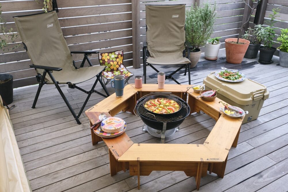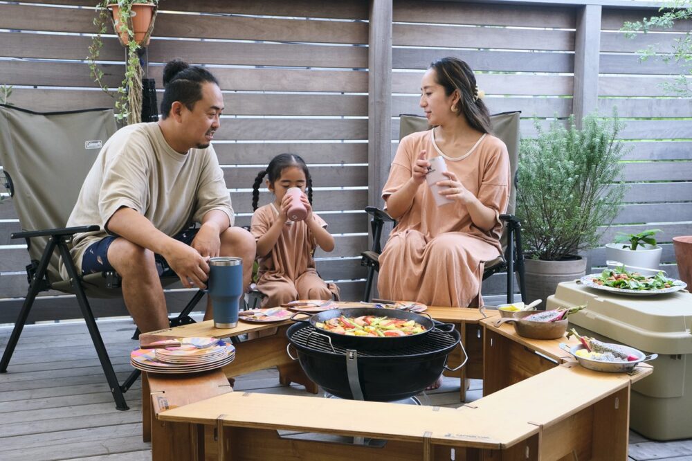 「最初は、おうちキャンプを楽しむためにギアを設営したりしていたけど、気がつけばそれが日常になっていました(笑)。タープも張れるから、雨も気にならないし、グリルを囲んだウッドテーブルは、家に居ながら気軽に焚き火気分を味わえます」