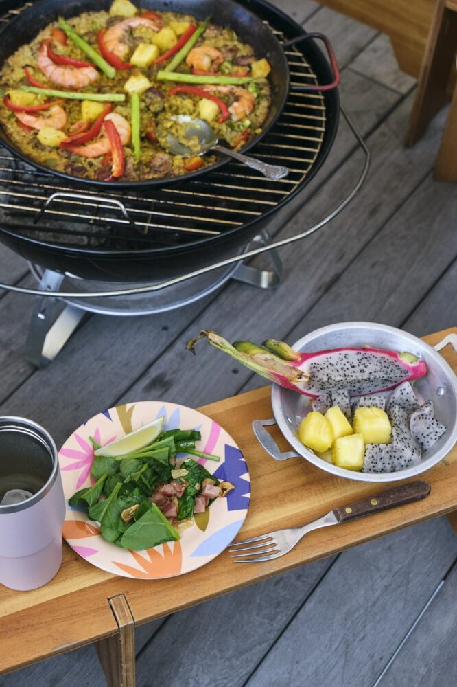 この日のメニューは南国風カレーパエリアと、ほうれん草とベーコンのサラダ。ドラゴンフルーツとパイナップルも用意。