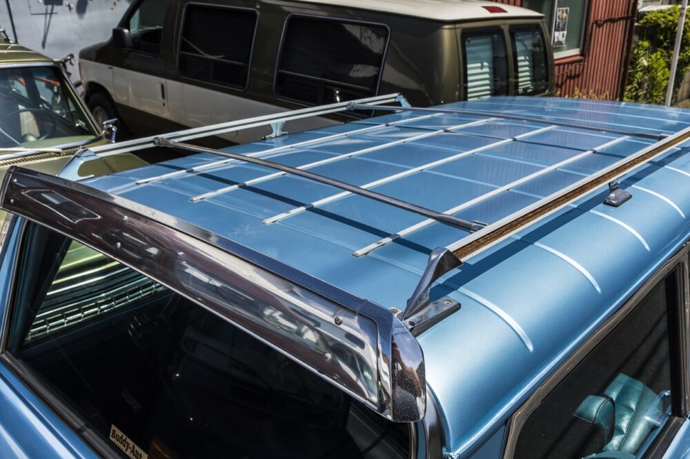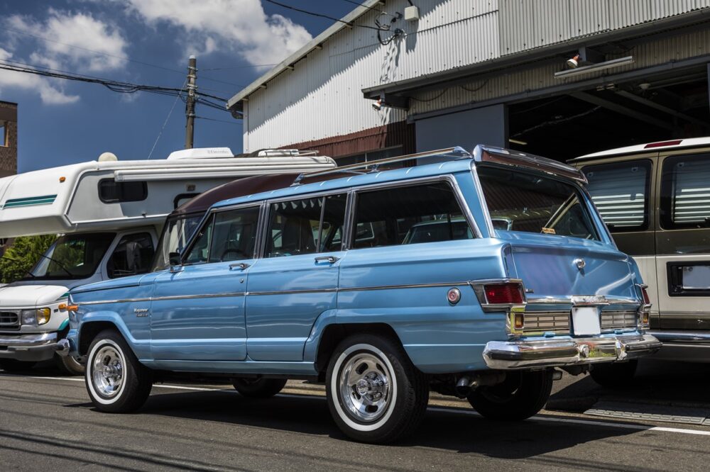 メタリックブルーに輝くジープ・ワゴニア。この個体はバディオートの顧客が乗っていたもので、現在リフレッシュを終えて再販売しているもの。今までの履歴がはっきりしているので、安心して購入することができる1台だ。