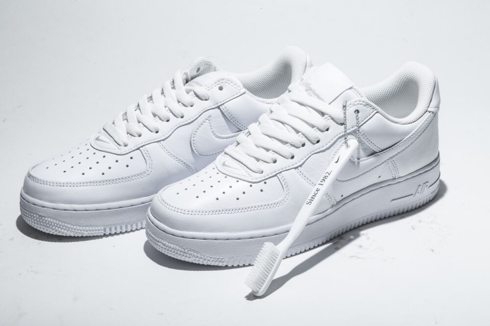 エアフォース1の生誕40周年を記念したCOLOR OF THE MONTHの第一弾は、トリプルホワイトのローカット。40年間のディテールの変遷をうまく融合。付属のブラシもポイントだ。1万6500円