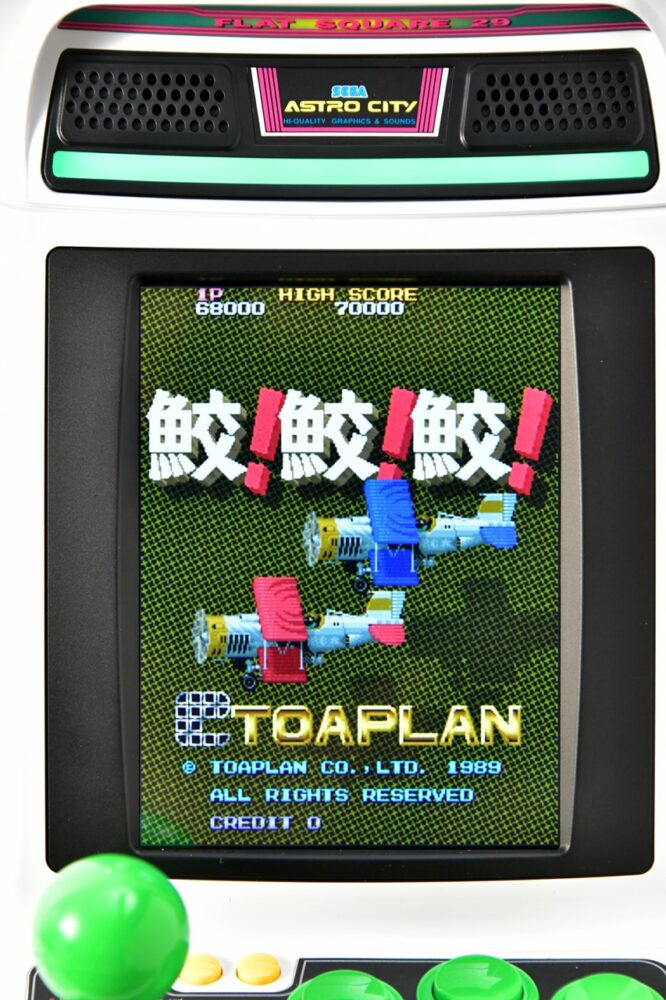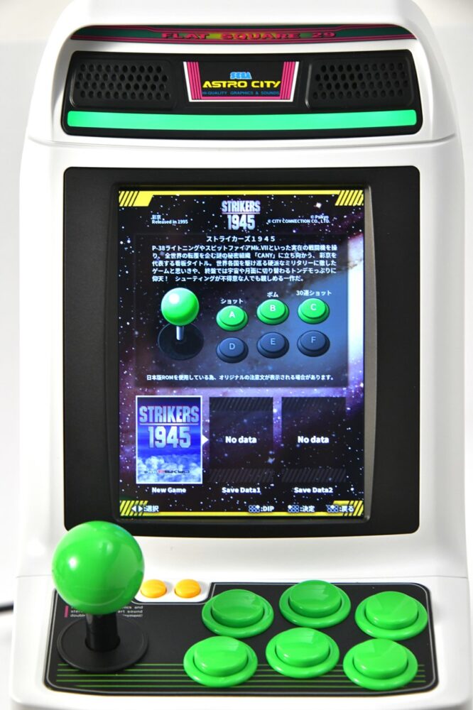 今回新たに登場したのが4.6インチの縦型モニターを搭載した『アストロシティミニV』。初代ミニが横型モニターで、バーチャファイターなどのアクションゲームが中心だったが、このVはシューティングゲーム専用機。セガのタイトルはもちろん日本物産、そして東亜プランなどの名作シューティングが全22作品収録されている。