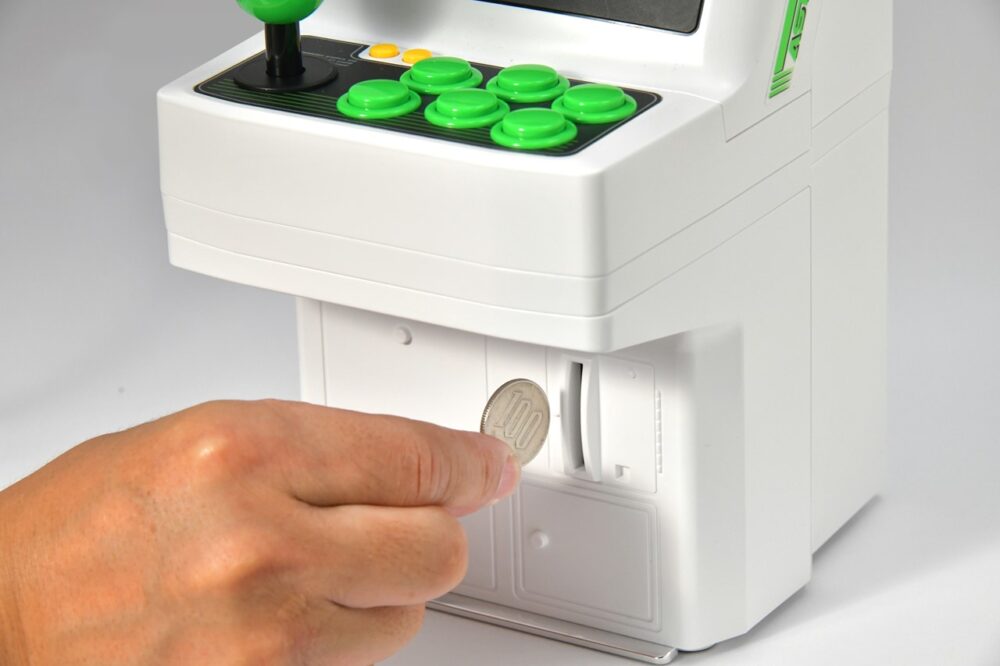 ベースや椅子で、よりゲーセンのスタイルに近づけられるキットも登場。貯金箱にもなる優れものだ。4378円