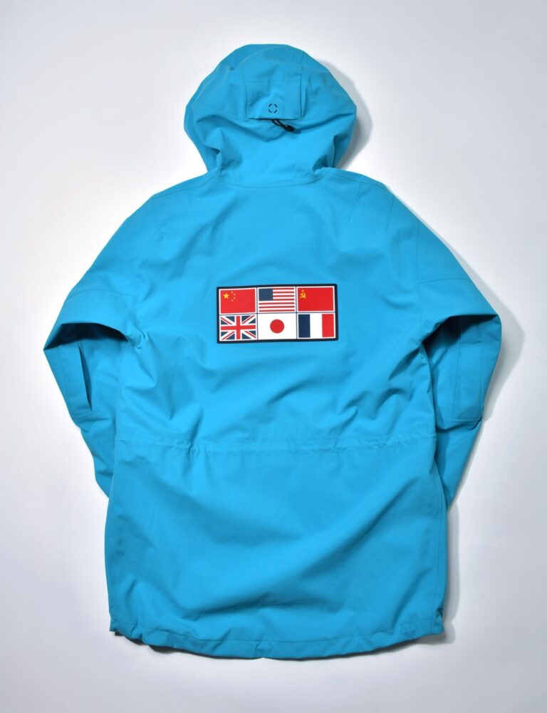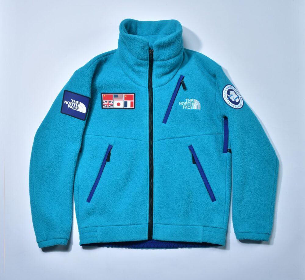使用済みペットボトルを原料としたマイクロフリース素材を使用し、高い保温力をもつ軽量ジャケット。右胸と背中に南極横断隊に参加した各国の国旗のシリコンワッペンをレイアウト。3万6300円