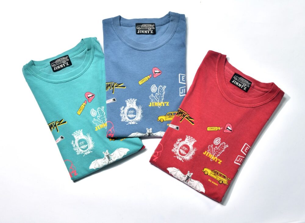 ヴィンテージJIMMY’Zのアーカイブのデザインをベースに現代版にアップデートしたデザインを、当時と同じ手法のシルクスクリーンプリントで施している。各4950円