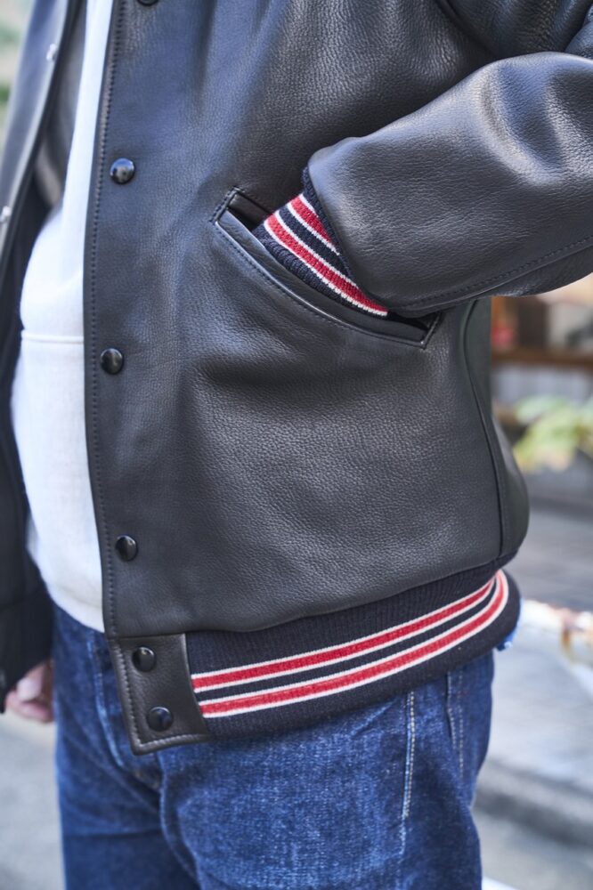 首、袖、裾の赤のラインリブが印象的なレザーのスタジャンを主役にデイリーに活躍するパーカとジーンズ、足元はコンバースをセット。ウエアハウスのジーンズ、S1003XXは3カ月ほど穿き込んでおり色落ちを楽しみ中。