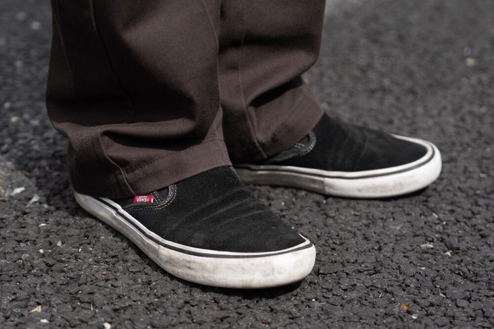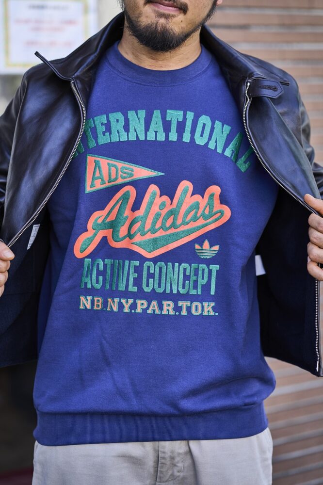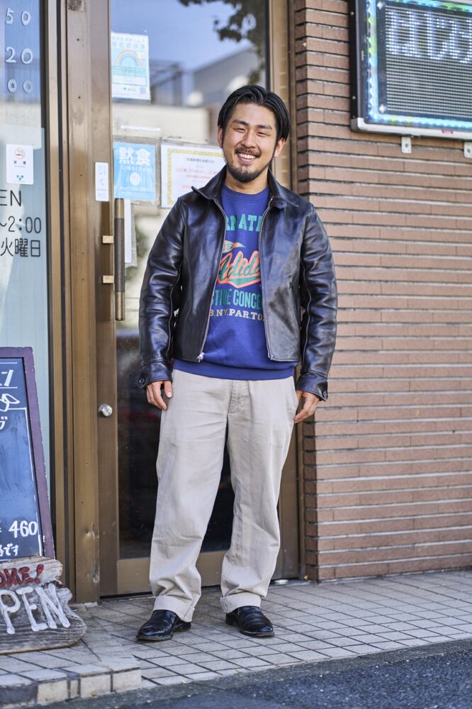 著名人も足繁く通う環八通りの老舗ステーキ店で店長を務める沖土居さん。ゆったりとしたコットンのパンツにインナーには1980年代のアディダスのスウェット。ビルトバックのジャケットに合わせてシューズは1960年代のレザーシューズを合わせた。
