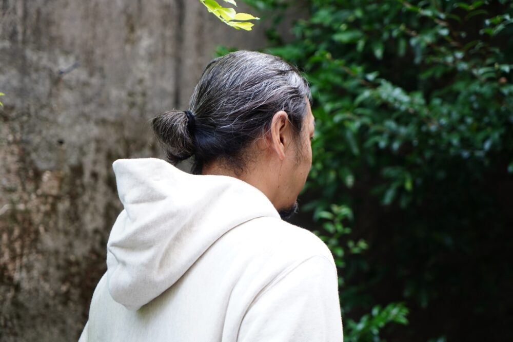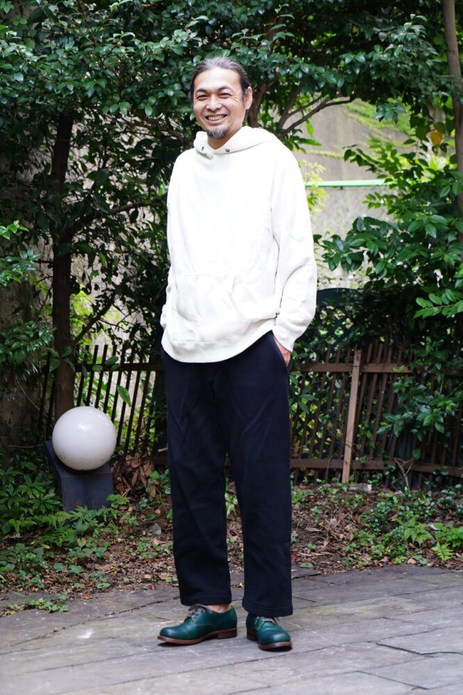 上品なモノトーンコーデだが、実は上下ともにスウェットというからおもしろい。トップスのスウェットパーカはモーターの今季のニューアイテム。アクセントになっているレザーシューズはモトのハンドダイである。