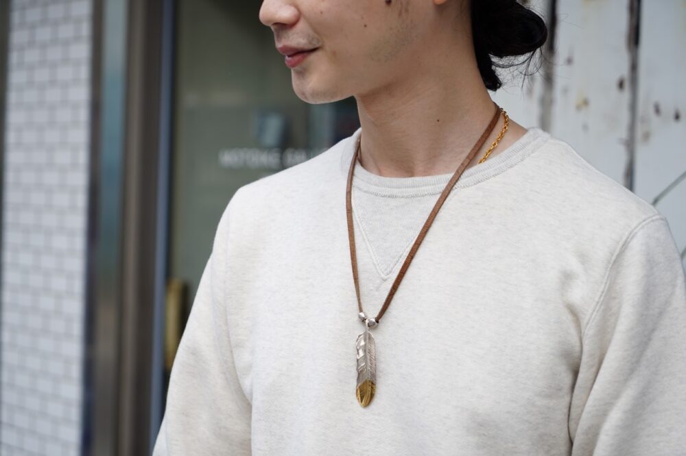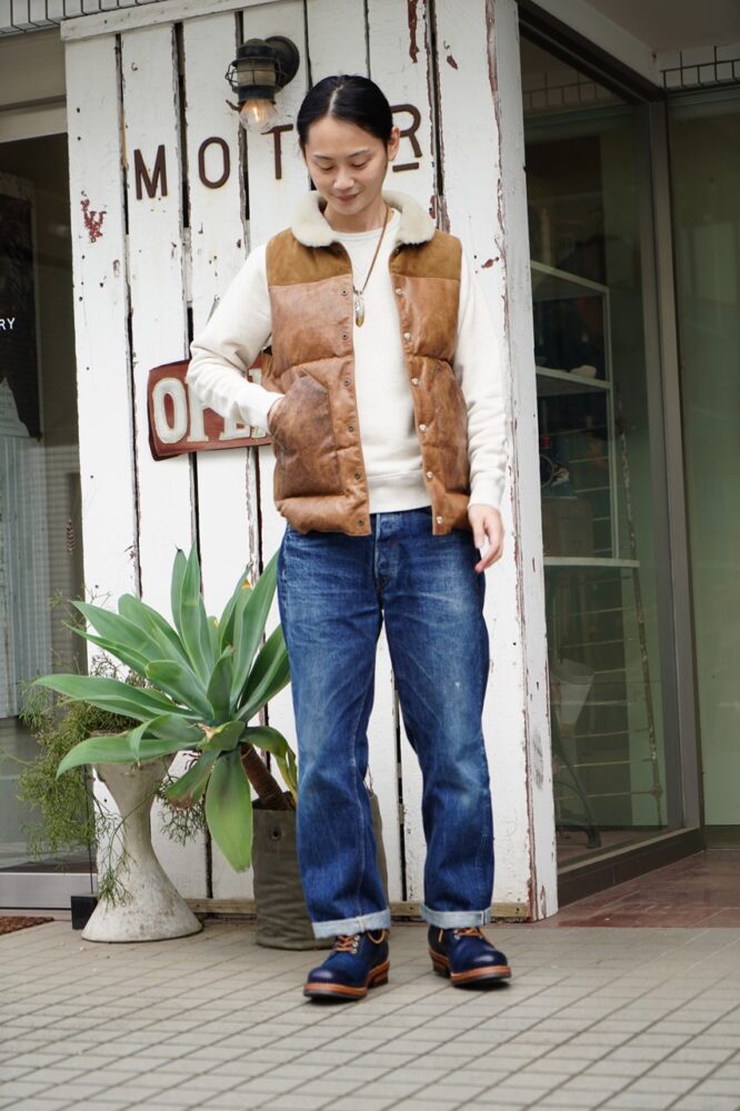 革人形作家であり、モトの創設者でもある本池秀夫氏がディレクションするモーターのレザーベストに、スウェットを組み合わせたコーディネイト。ともに新作で注目のアイテム。見事なエイジングとなったジーンズもモーターの定番商品である。