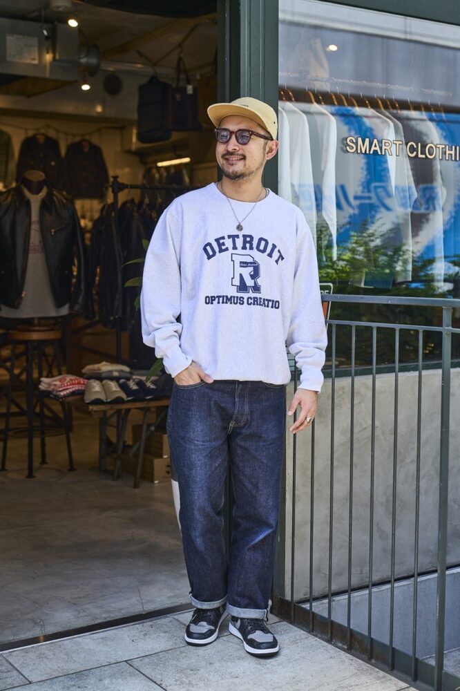 フェローズのシンプルなプリントスウェットにジーンズを合わせた定番アメカジスタイル。プリント色をデニムに合わせシューズはモノトーンで全体的に落ち着いた色のコーディネイトだが、イエローのキャップでアクセントを付けている。