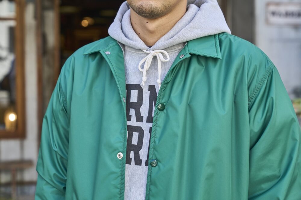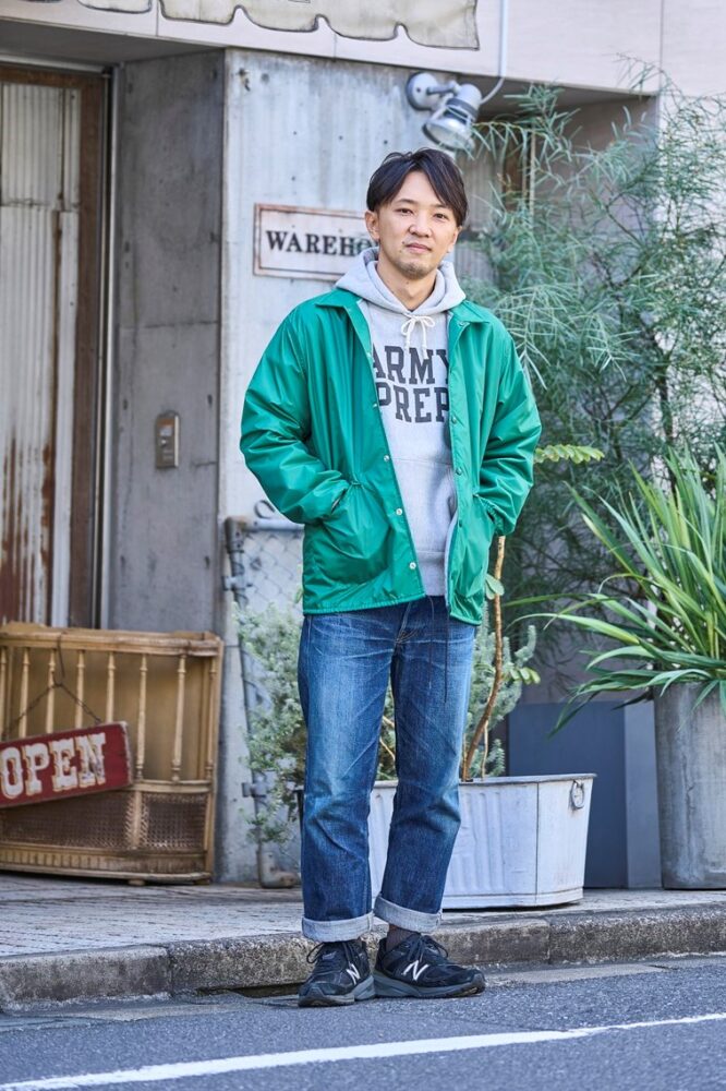 穿き込み1年半ほどのウエアハウスの定番ジーンズ、Lot.1000XXをくるぶし丈までロールアップし、ヴィンテージライクなスウェットパーカとスポーティなグリーンのコーチジャケットでコーディネイト。足元はブラックのニューバランスで引き締め効果とスポーティさをプラス。