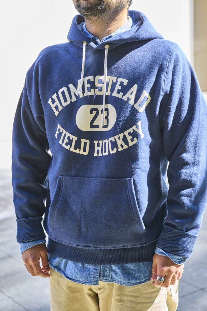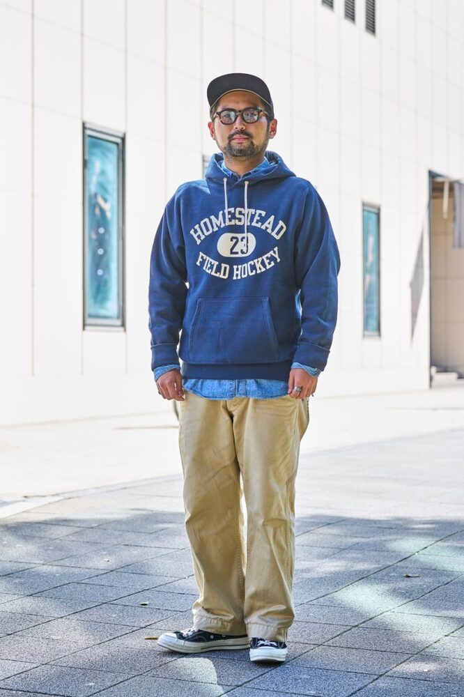 シャンブレーシャツの上にウエアハウスの今季のスウェットパーカをコーディネイト。パンツは、ゆったりシルエットでブルーと相性の良いチノトラウザーズを合わせた。ベースボールキャップでアメカジど定番のスポーツミックススタイルに仕上げた。