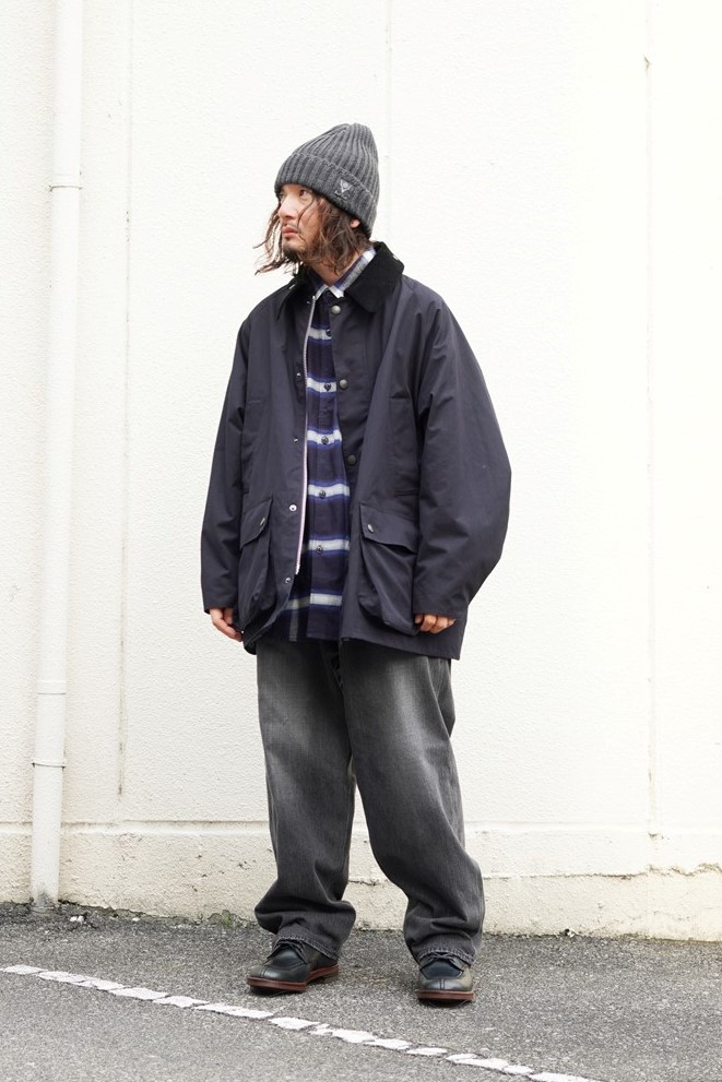 ハンティングジャケットも広く捉えるとスポーツジャケットのひとつ。そんな王道アイテムをビッグサイズで着ることで今っぽい印象にまとめている。インナーとボトムスはともにゴールドの新作。足元にはパラブーツでスタイリッシュな印象に。