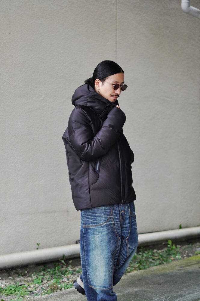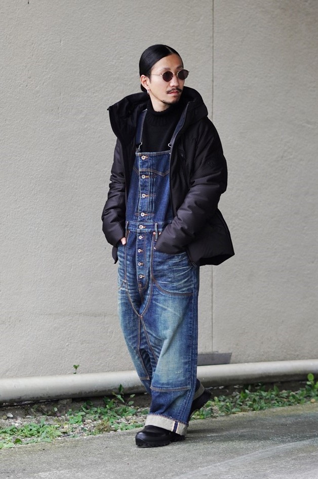 シュガーヒルのオーバーオールに、デサントオルテラインのジャケットでワークとスポーツのテイストをブレンド。ブラックを基調とすることで、全体的にまとまった印象にしている。足元にボリュームを出して、トップスとの調和性を図っている。