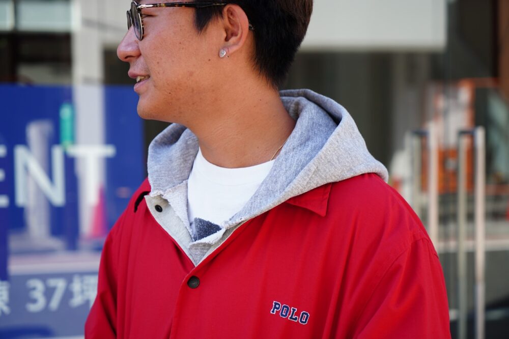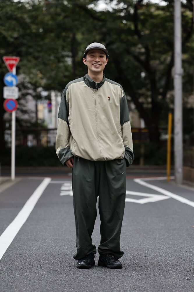 中目黒にある人気ヴィンテージショップの名物スタッフである内田さんは、’90sのナイキのセットアップで登場。大きめのサイジングやカラーリングなど、ストリート的な着こなしが抜群にうまい。足元をブラックにして、落ち着いた印象にしている。