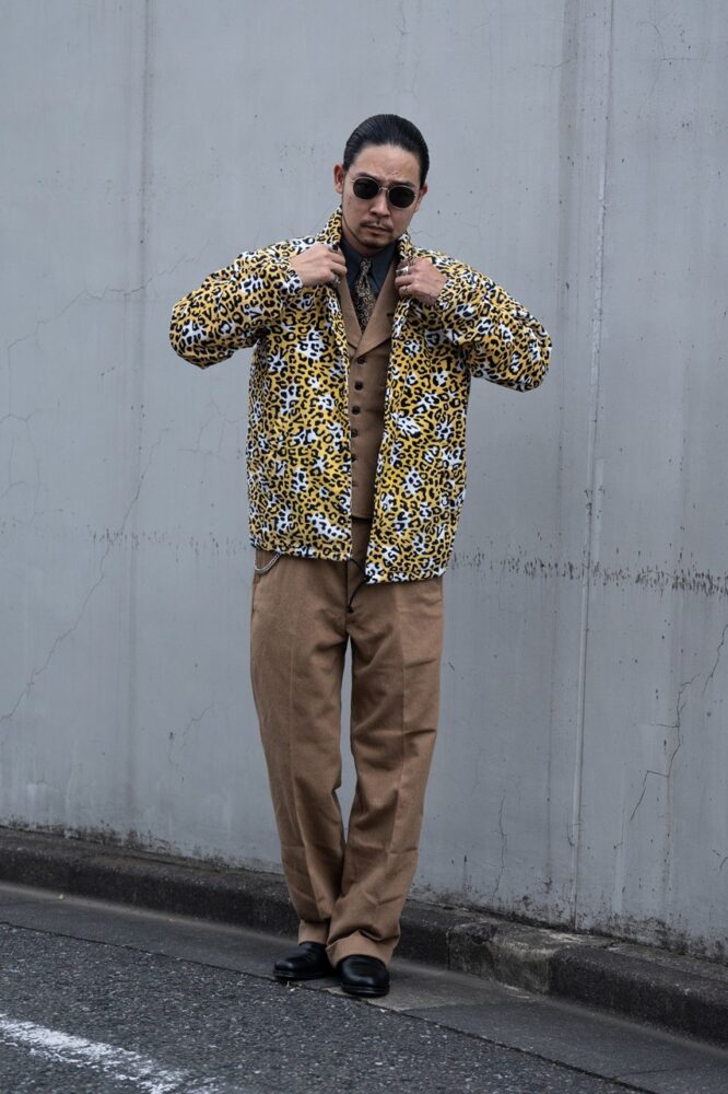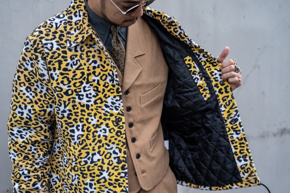 インパクトの強いレオパード柄のコーチジャケットをクラシカルな3ピースに重ねた上級コーデ。スポーツとフォーマルのテイスト自体のコントラストが強いため、近いカラーリングで統一して馴染ませたテクニックが見所。