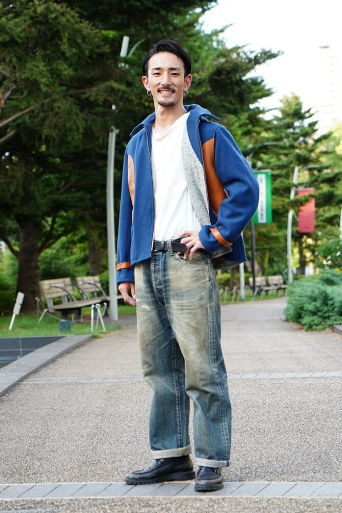 戦前に流行したスポーツジャケットをメインとしたスタイリングを披露したのは、人気バーバーで働く金子さん。ジャケットはバイグラッドハンド。インナーをタックインすることで、うまくバランスを取っているのも注目したいポイント。
