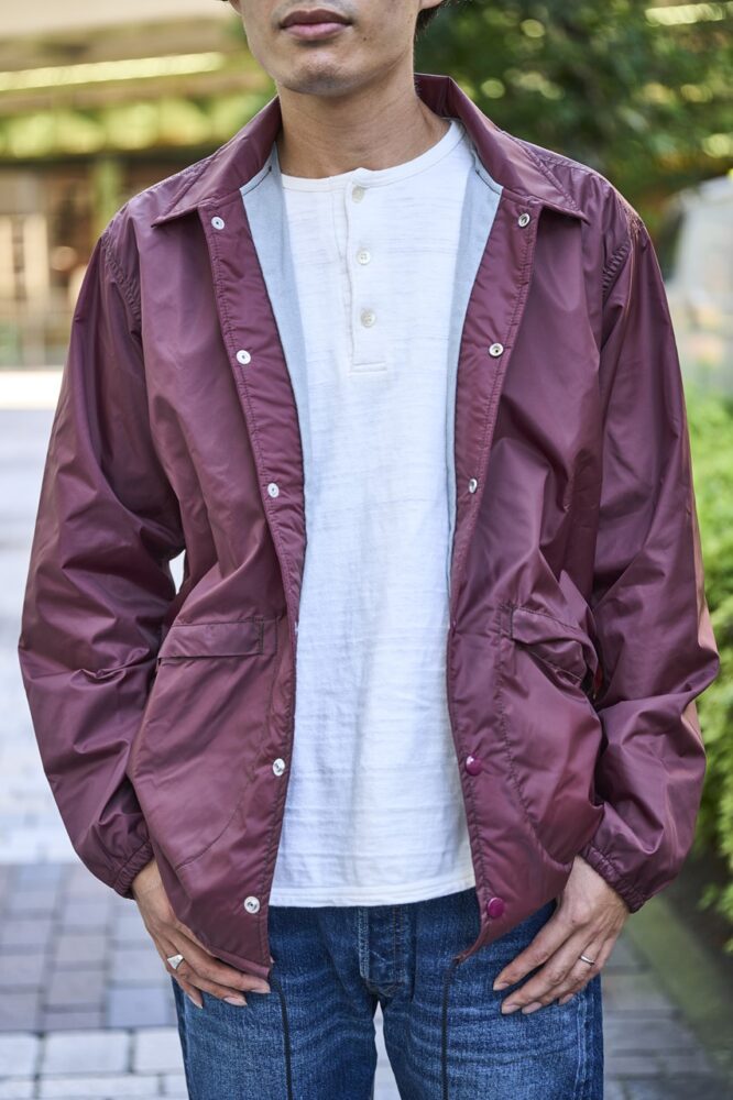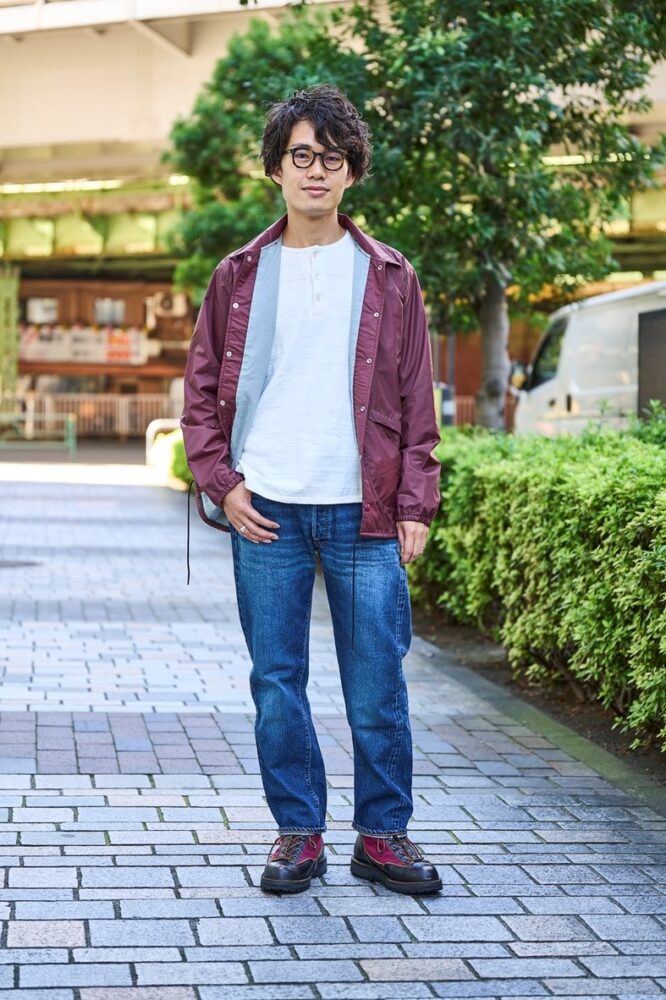 コーチジャケットとブーツをカラーリンクコーデ。カラーがアクセントのスタイリングであるため、Tシャツとジーンズのシンプルな組み合わせ。ただしTシャツはヘンリーネックで、袖が切り替えのベースボールTを着用したナチュラルなスポーツ感がよし。