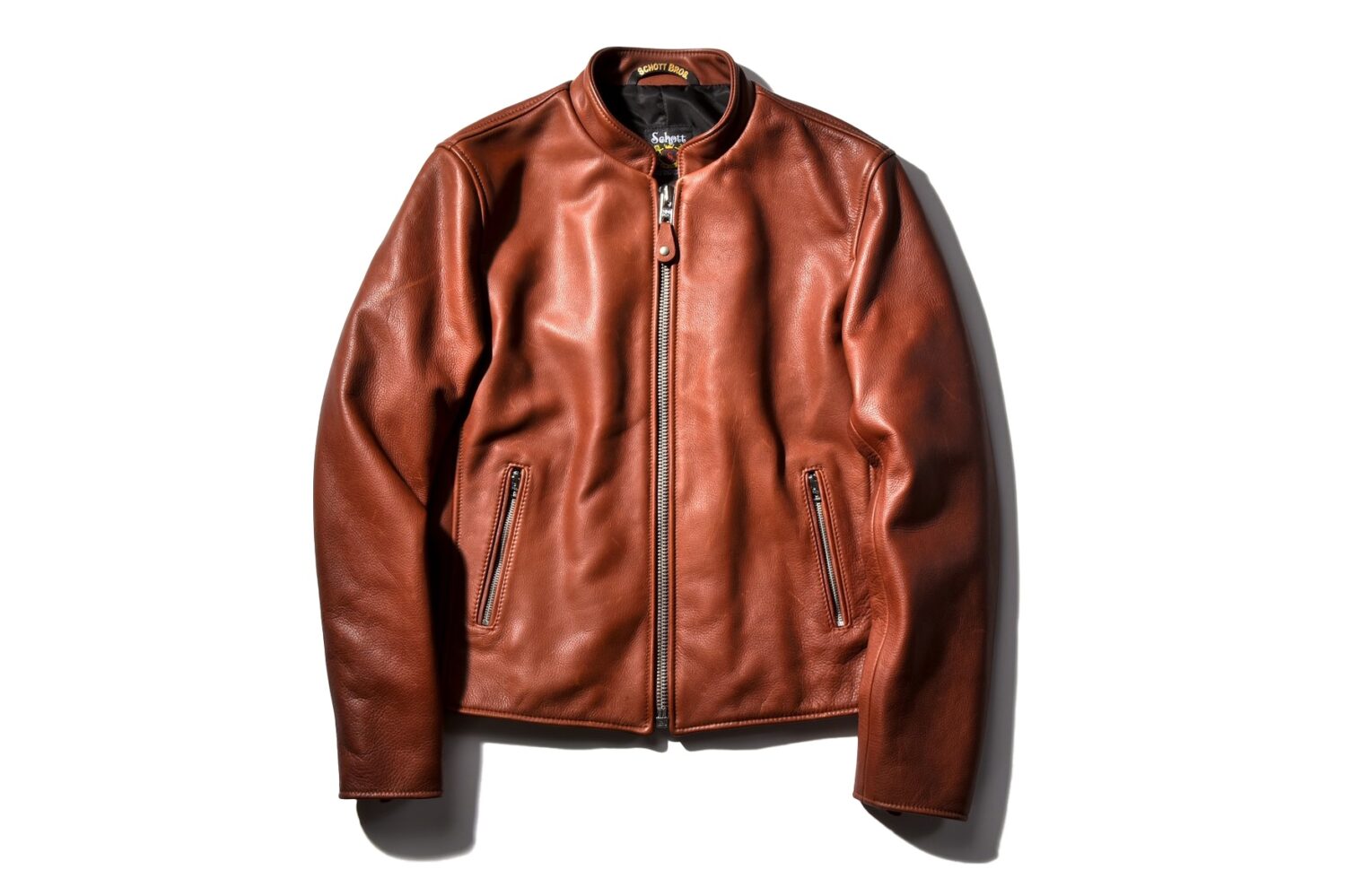 襟付きシングルライダースよりさらにミニマルなデザインで、流行に左右されないスタンドカラーのシングルライダース。ワイルド且つ着こなしやすいスタンドカラーのこちらの「551US Cow New Naked Single Riders」は肉厚でシボ感を残した上質なカウハイドながらも、柔らかく仕上げている。無駄のないソリッドなデザインはコーディネイトを選ばず、流行にも左右されないため長く愛用できる。ボディと同じ革がスライダーの引き手に付けられたフロントファスナーには「SchottNYC」の刻印が入れられたオリジナルファスナーを採用。脇の下にはベンチレーション機能を持つアイレットが。カラーはブラウンのほかブラックもあり。13万2000円