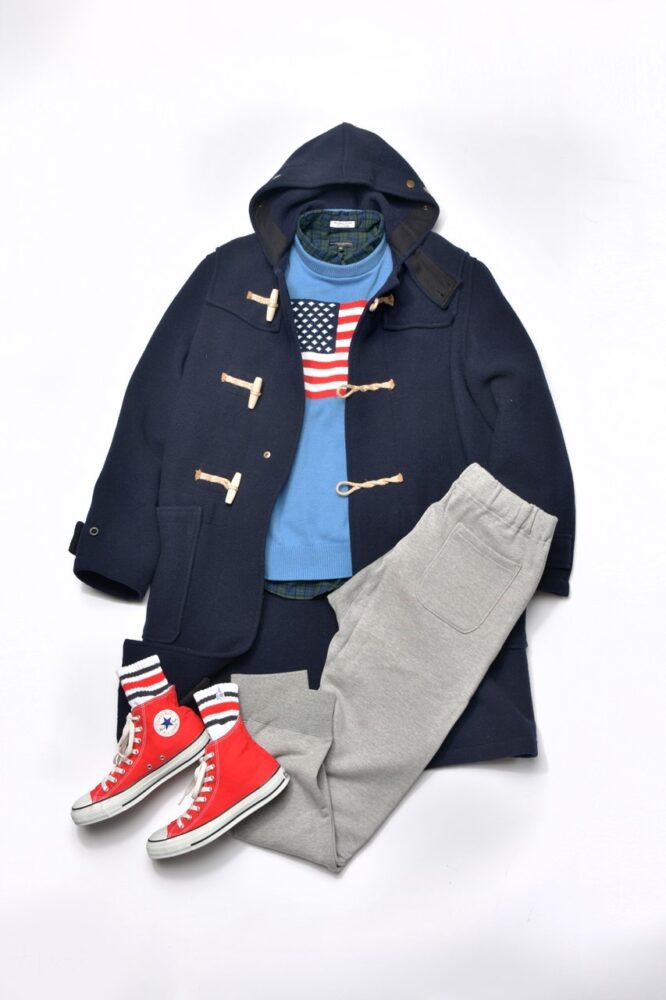 イギリス軍発祥のダッフルコートは、制服の上から羽織ることのできるオーバーサイズのシルエットと、海軍帽の上にかぶっても十分な大きなフードが特徴。’50 ~ ’60 年代にかけて安価なサープラスとして出回り、学生たちのお気に入りとなった。そんなダッフルコートは、スウェットパンツでラフに着こなすスポーツスタイルがオススメ!