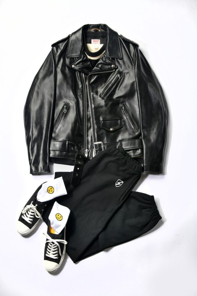 本来はバイクウエアであるダブルライダースジャケット。ロックや不良といったワイルドなイメージが付きまとう。それだけに普段のアメカジコーデならそのイメージに合わせたアイテム選びがセオリー。でもスポーツMIXコーデとしてスウェットパンツを選ぶなら、革と同色のブラックで統一感を出してみる。それだけでストリート感のあるスポーツMIXコーデの完成である!