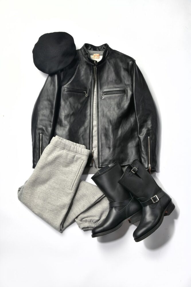 シンプルなスタイルで人気を集めるシングルライダース。ダブルライダースと同様に、レザージャケットとスウェットパンツを同色で統一するとオシャレに決まるがそれでは面白くない。そこで今度はモノトーンでまとめてみる。スウェットパンツの定番色であるグレーなら、着こなしは重くならずに骨太なスポーツMIXコーデが楽しめるはずだ。