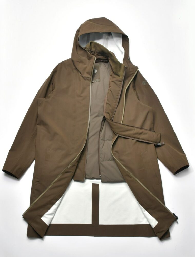 高機能素材DERMIZAX® DWR TUSSAH 3Lを表地に使ったアウターシェルに取り外し可能で単体で着用可能なダウンベストが付く。7万4800 円(デサントブラン代官山 TEL03-6416-5989)