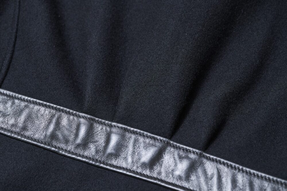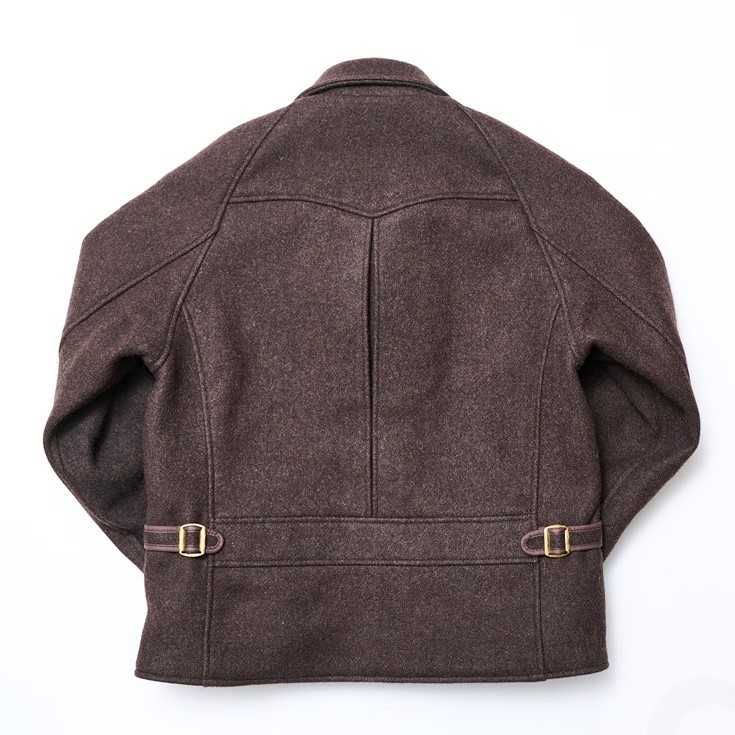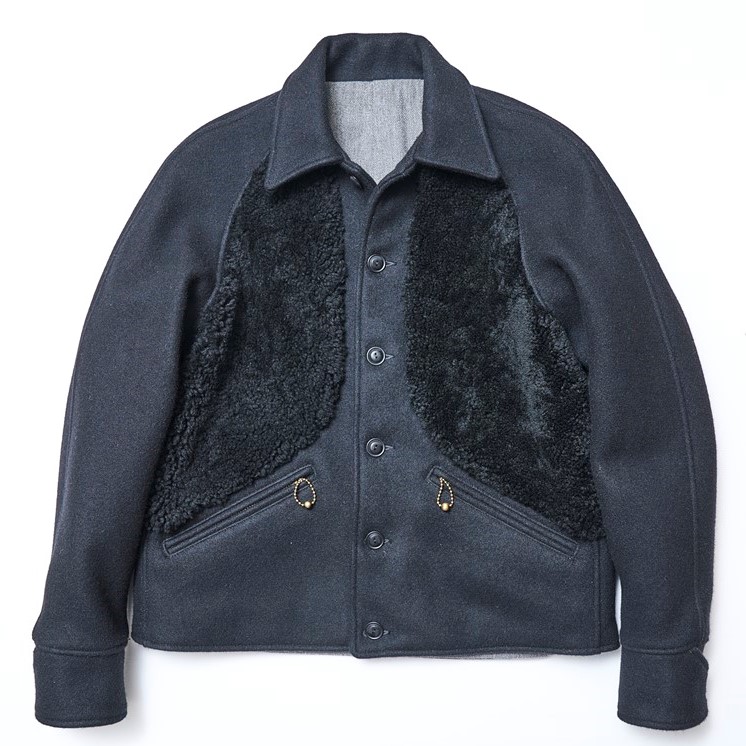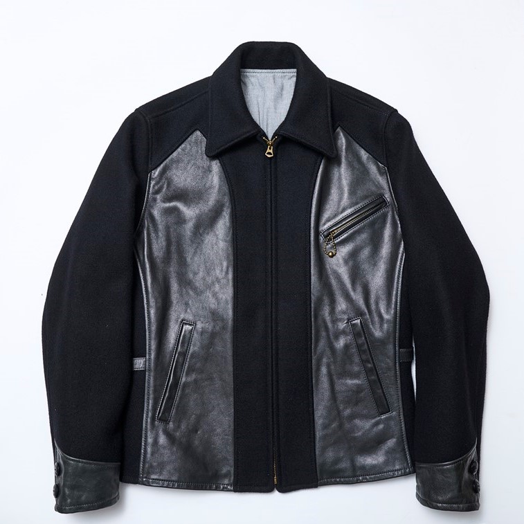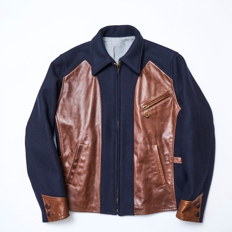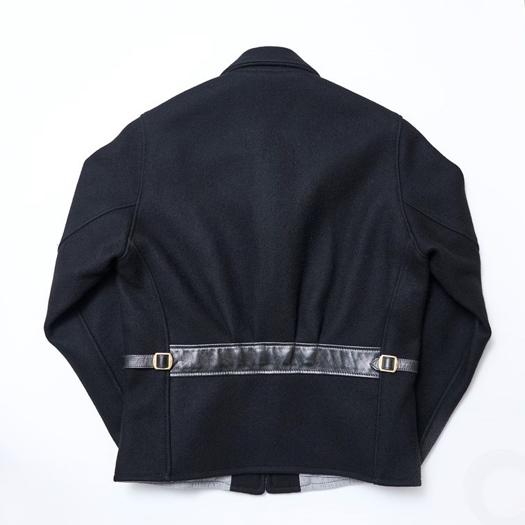1940年代に作られたメルトンとレザーのコンビが秀逸なスポーツジャケットをベースにモダンにアレンジしたジャケット。2重織りのヘビーメルトンに柔らかくしなやかなホースハイドを切り替え素材に使用したカフスやバックのアジャスターベルトにも同じレザーが使用されアクセントとなっている。