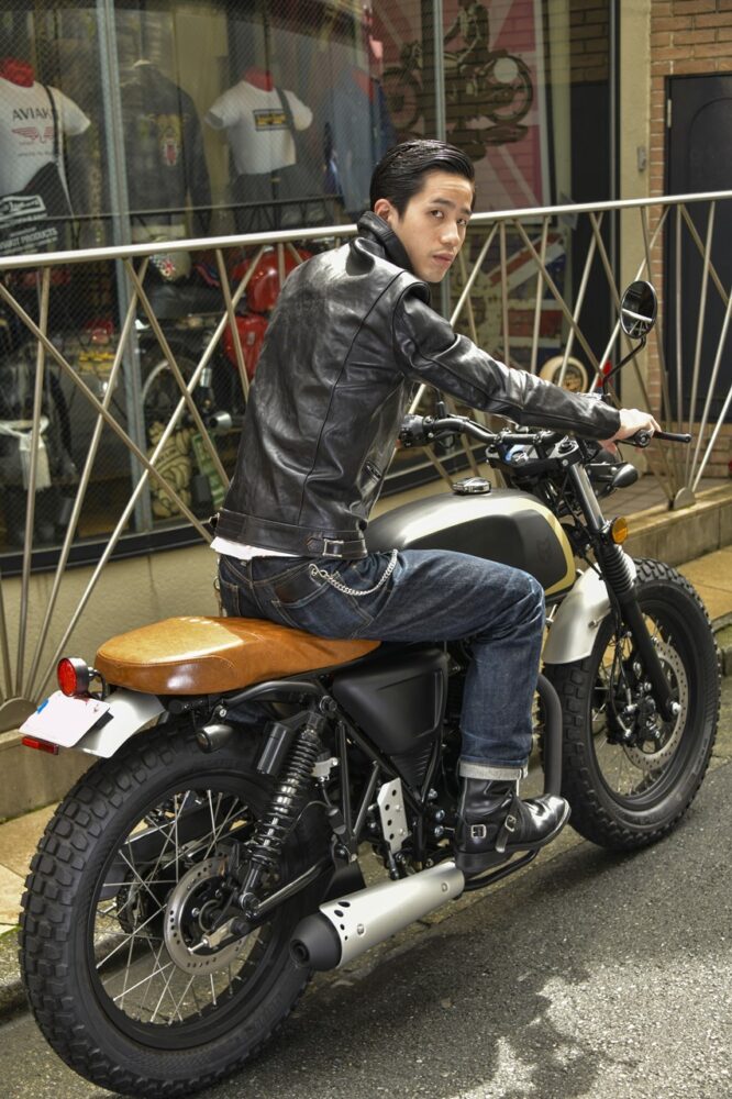 (安田さん)英国を代表するモーターサイクルジャケットブランドであるルイスレザーズの日本の旗艦店に務める若手スタッフ。普段は国産旧車に乗っている。名作サイクロンを着用。