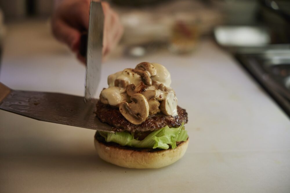 3種類のマッシュルームのソテーを黒毛和牛100%のパティに載せた看板メニュ―。鮮度を維持するため、マッシュルームは朝に仕込んだ分だけの10食限定。1620円(レギュラー)