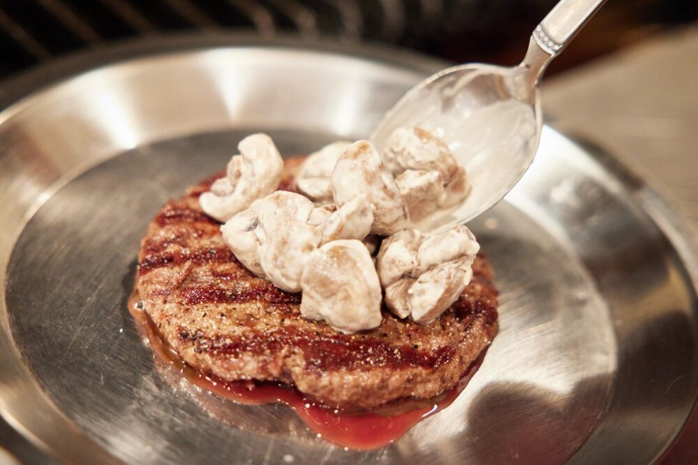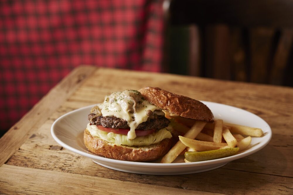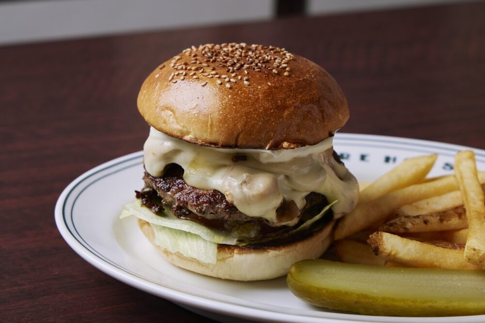 粗挽きのパティと、溶けたステッペンチーズが生のマッシュルームを包み込む、絶妙な食感のコントラストが楽しめる。東京グルメバーガーの元祖と言われる銘品。1859円