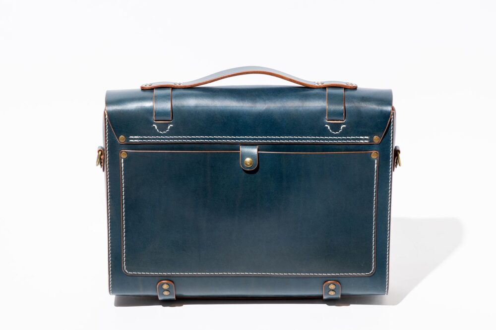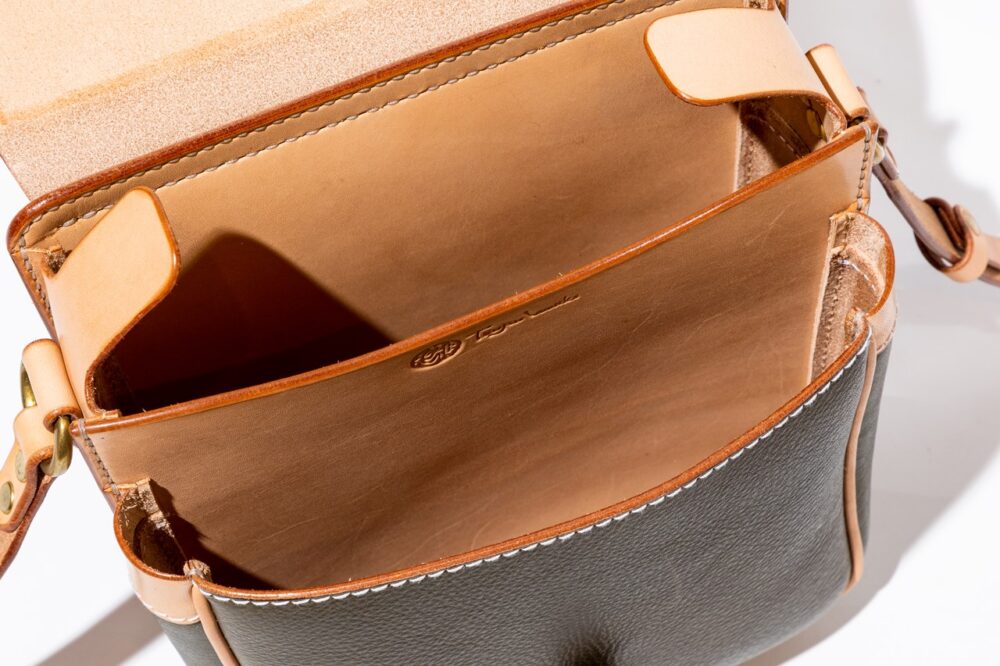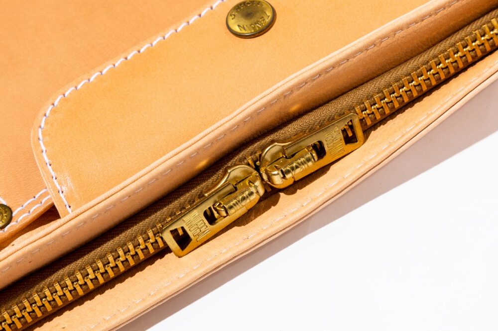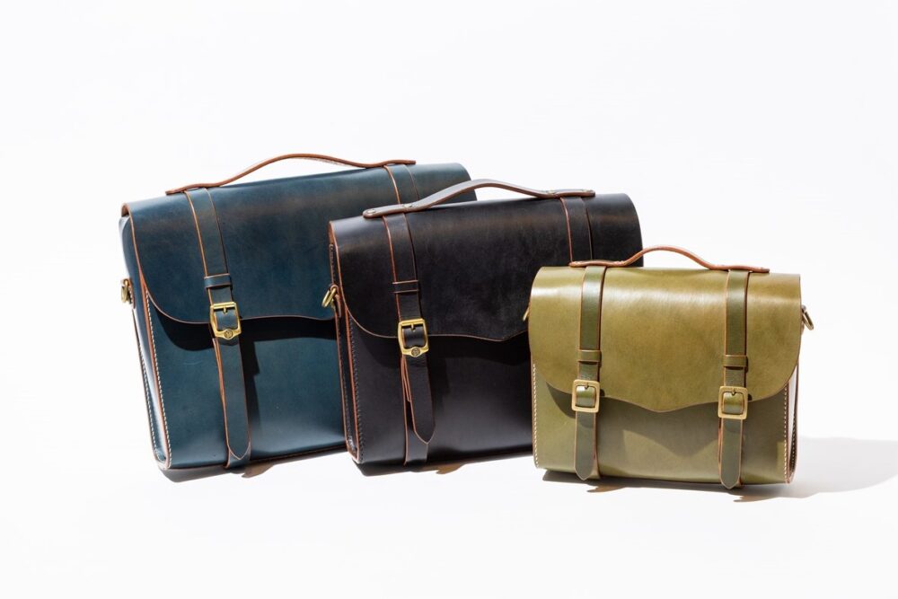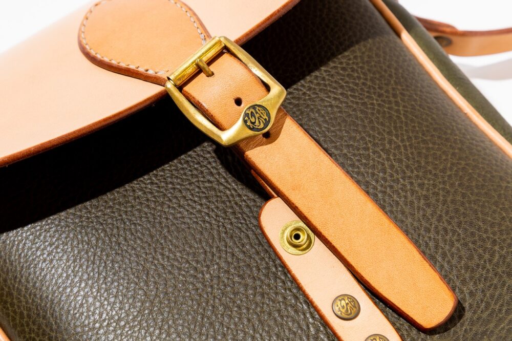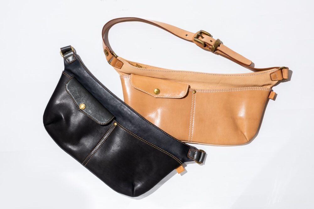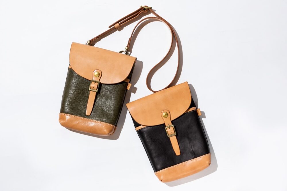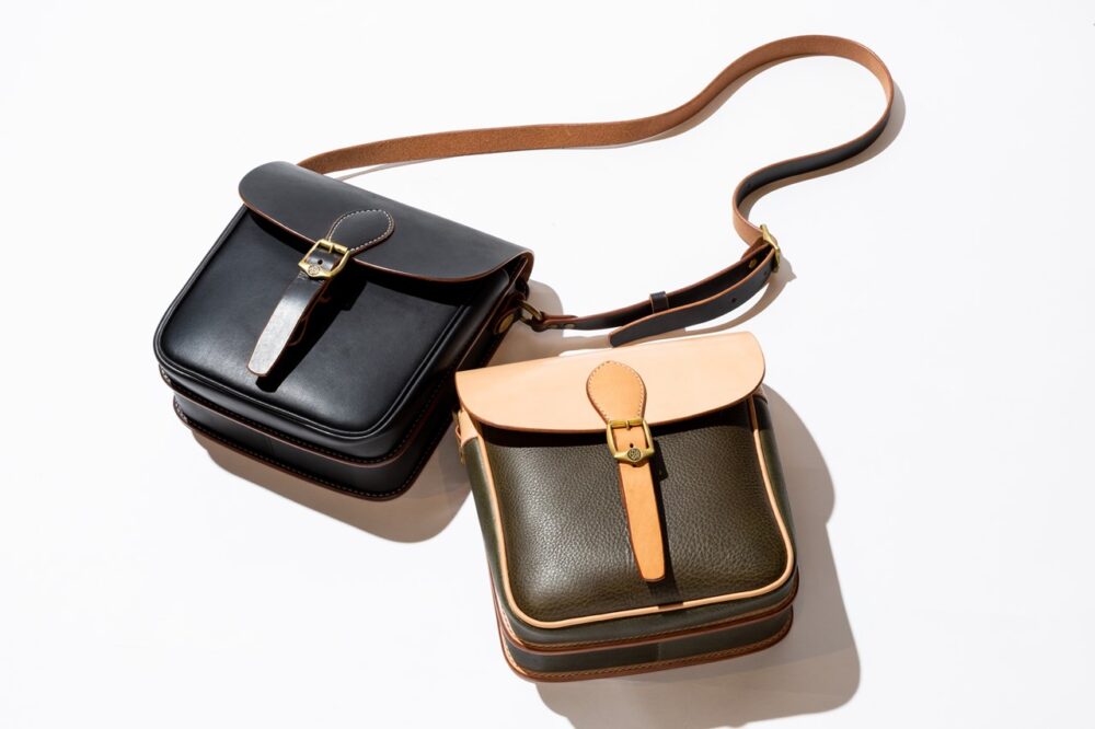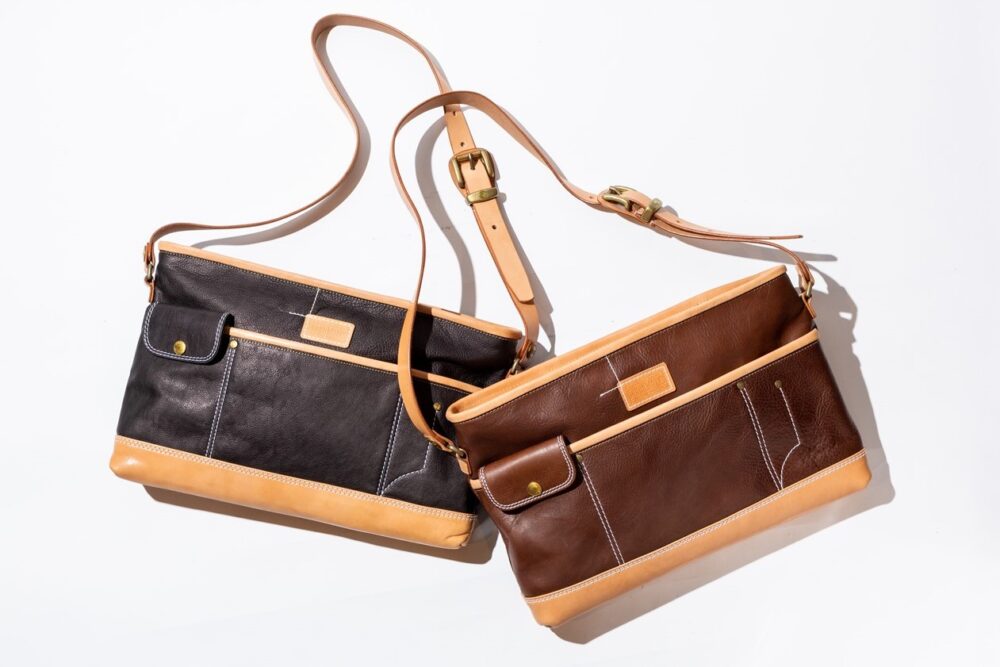A4横型サイズのショルダーレザーポーチは、1940年代のワークウエアのディテールを思わせるポケットやステッチングがデザインの魅力。もちろんすべて熟練した職人によるハンドメイド。7万5900円
