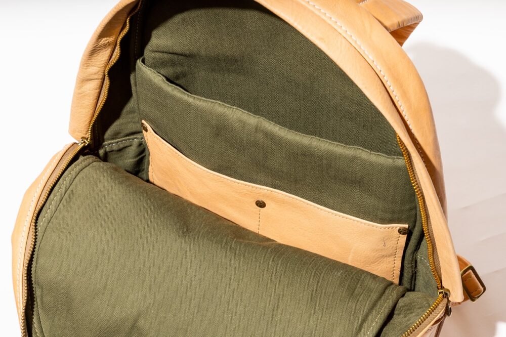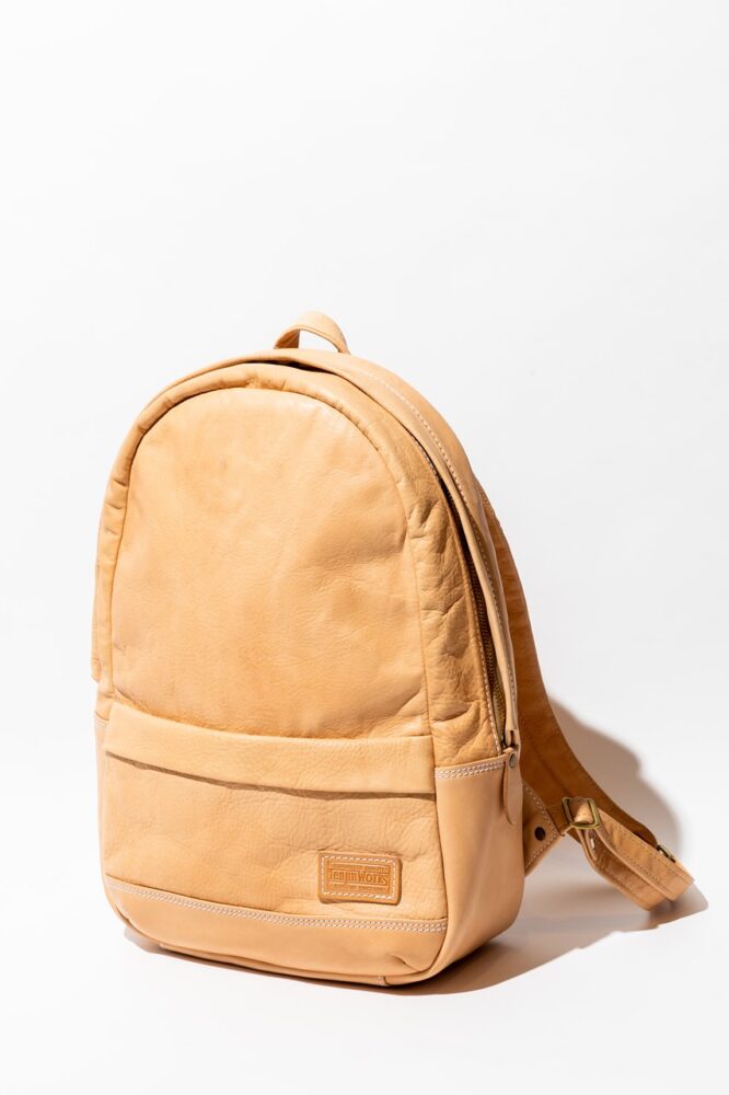 カジュアルに背負える定番バックパック。比較的ナローなフォルムに仕上がっていることと上質な革を使用しているため、ジャケットスタイルなどに背負っても違和感なく馴染んでくれる。頻繁に出し入れするアイテムは外側のポケットに収納。8万8000円
