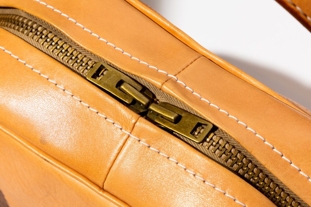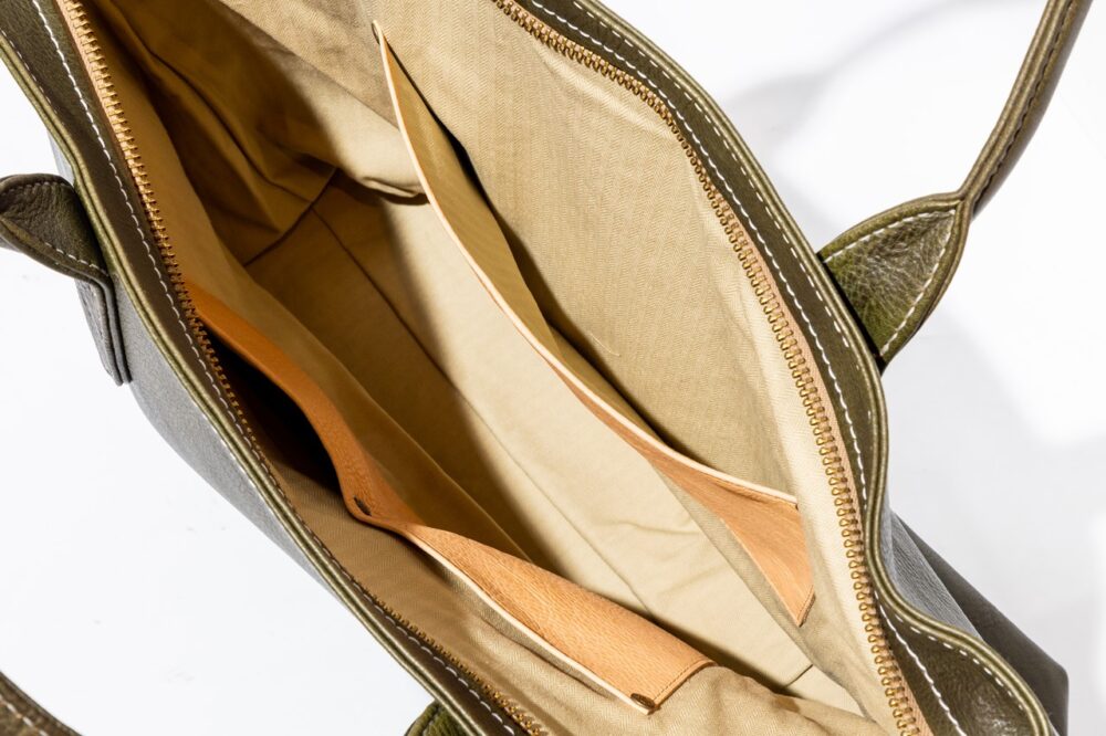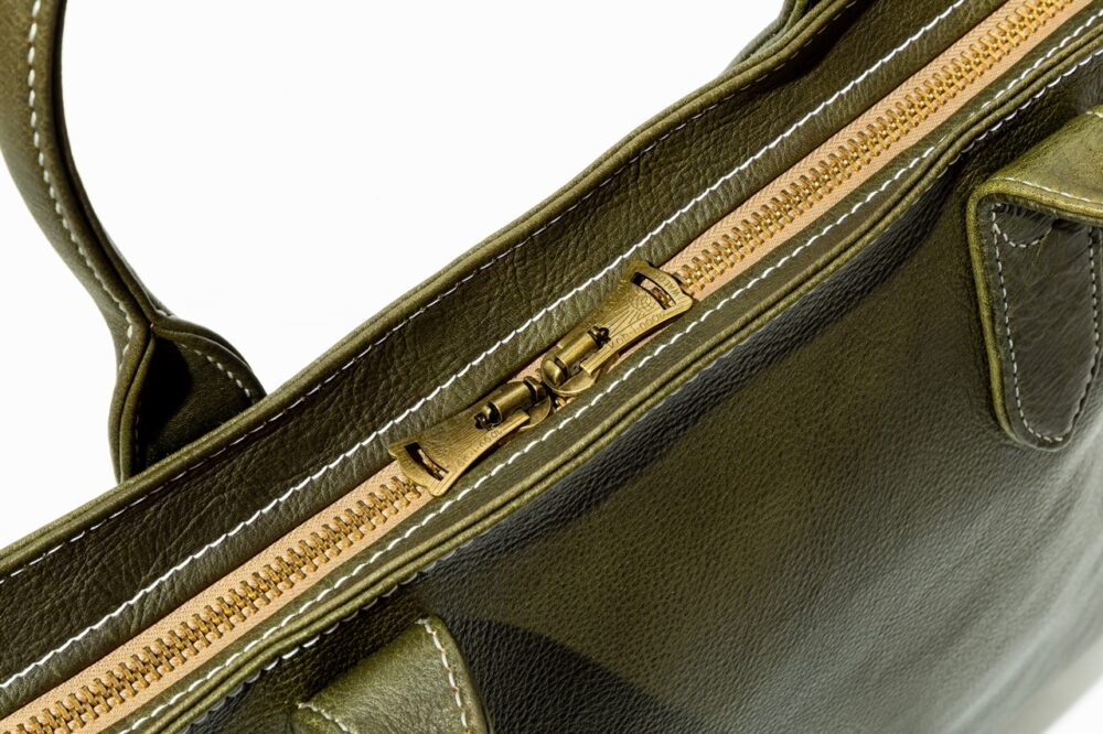 TT01の開口部にファスナーを装備。バッグを傾けてしまった際に収納物が飛び出さないための仕様。丸みのあるハンドルと飽きのこないデザインが良し。S / 7万9200円、M/ 9万200円、L / 11万2200円