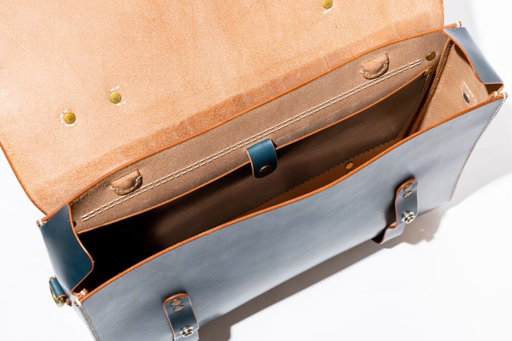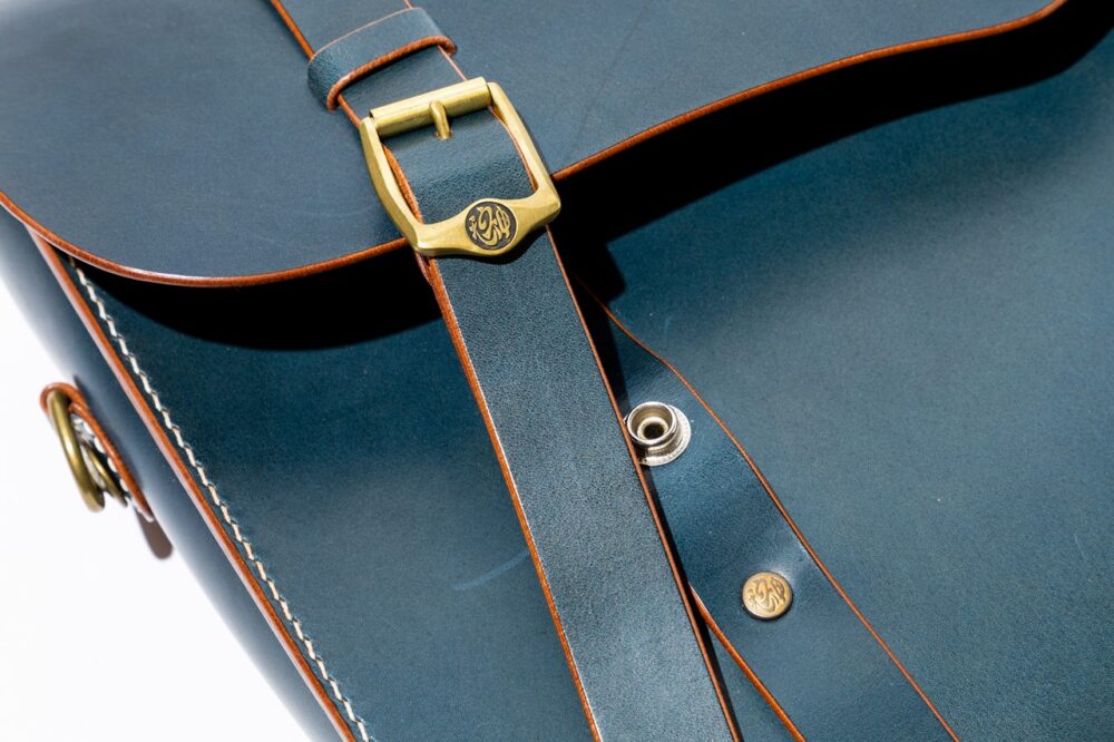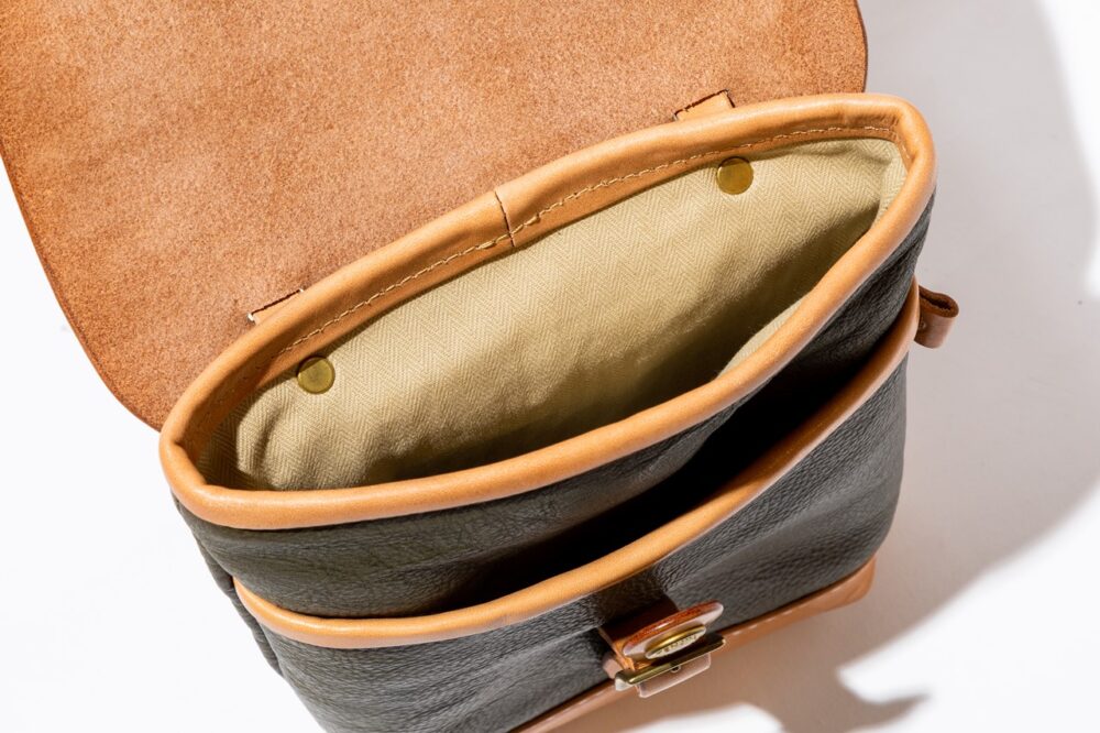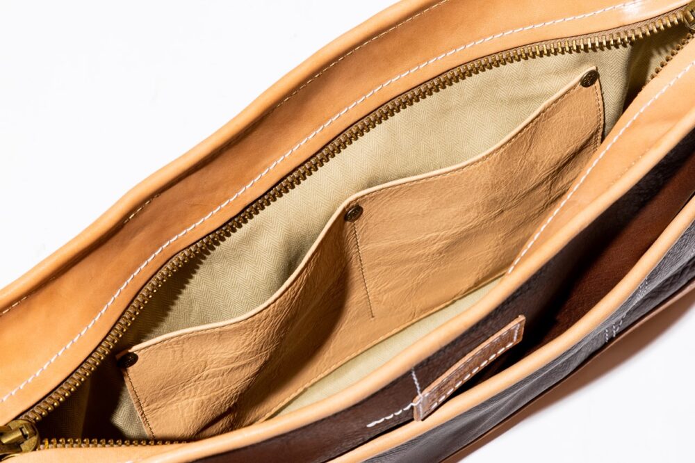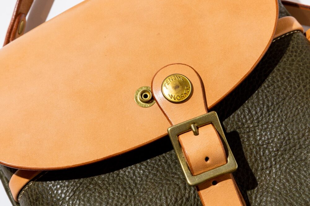 3種の革をパーツによって使い分けたエプロン型のバッグ。片側のフラップポケットにはオリジナル刻印の真鍮製のドットボタンが使用されアクセントとなっている。6万4900円